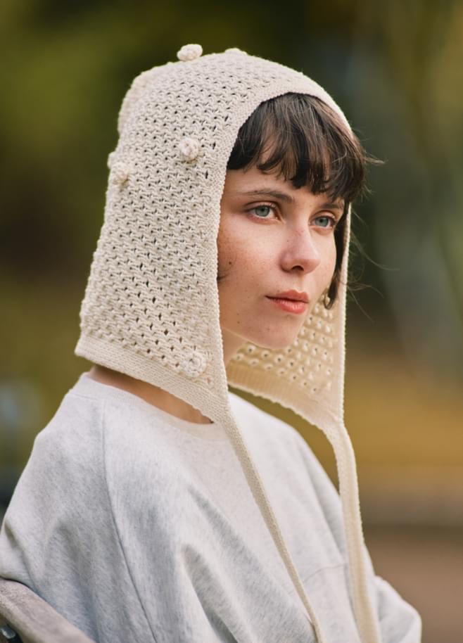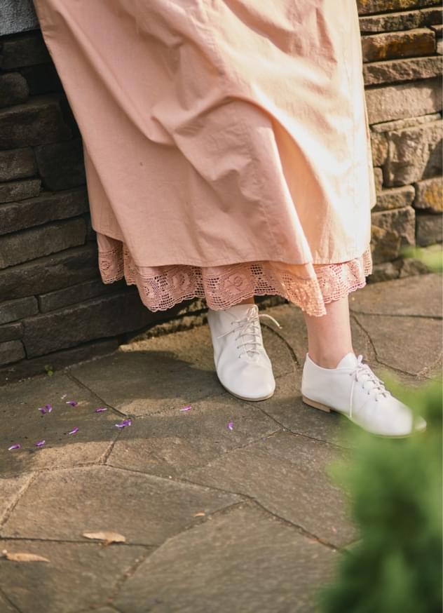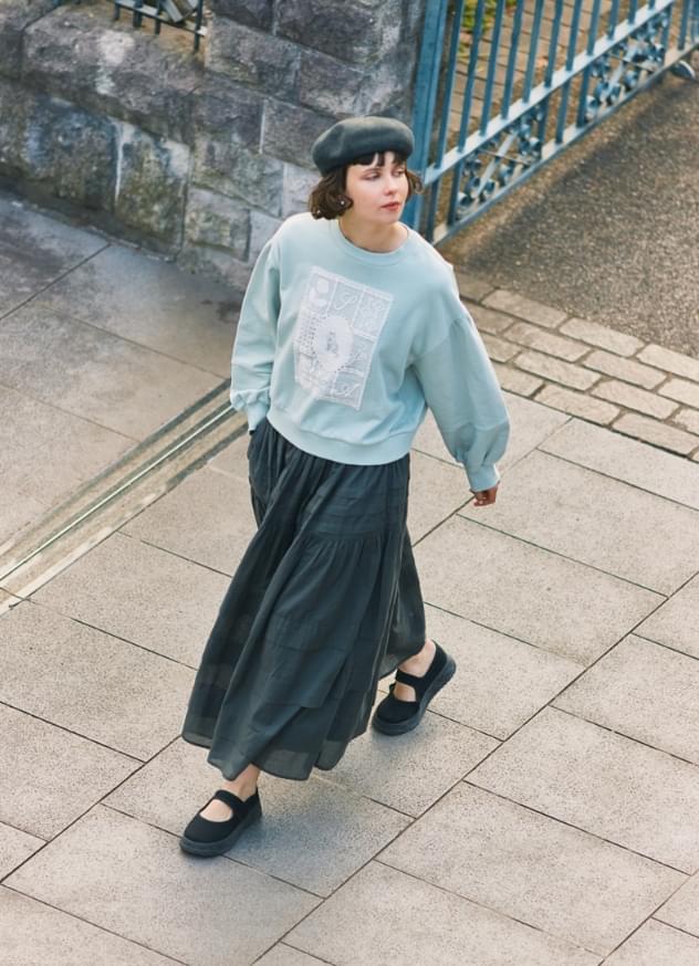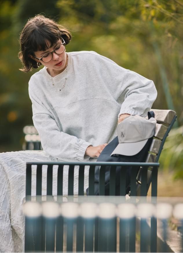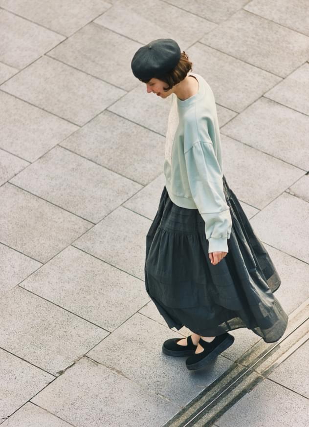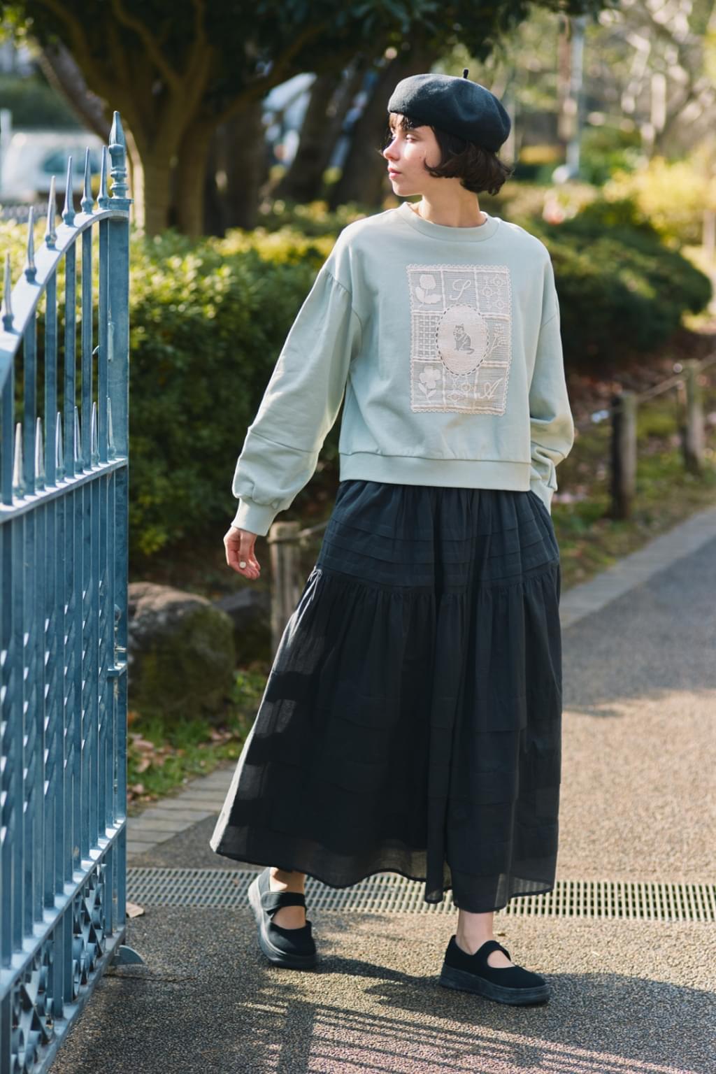 スウェットとスカートのシンプルなスタイルも、ディテールが可愛いアイテムを合わせれば華やかに。猫のレースモチーフがついたスウェットはドロップショルダーと袖のボリューム感が小さなポイント。軽やかな綿麻のスカートはタック&ギャザーで美しく広がるシルエットに注目。