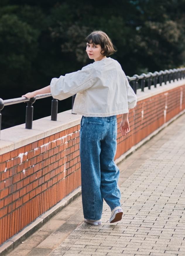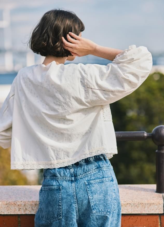 着るだけで春を感じられるレースのブラウスは合わせやすいショート丈。はしごレースに刺繍など様々な種類のレースを組み合わせ、フロントはリボンを結んで。小花柄のインナーを覗かせて思い切りガーリーに合わせるのが春の気分。ワイドなケミカルデニムで甘さをおさえてカジュアルに。