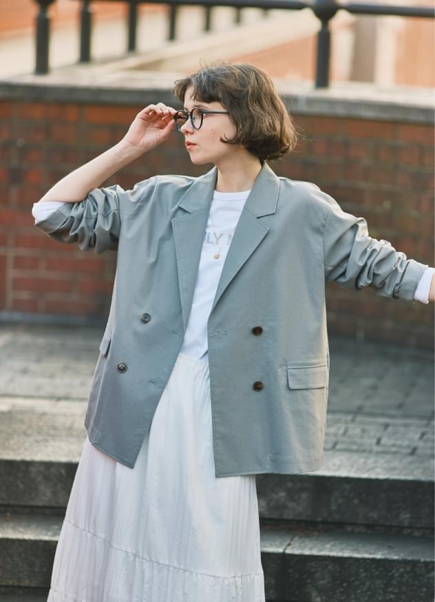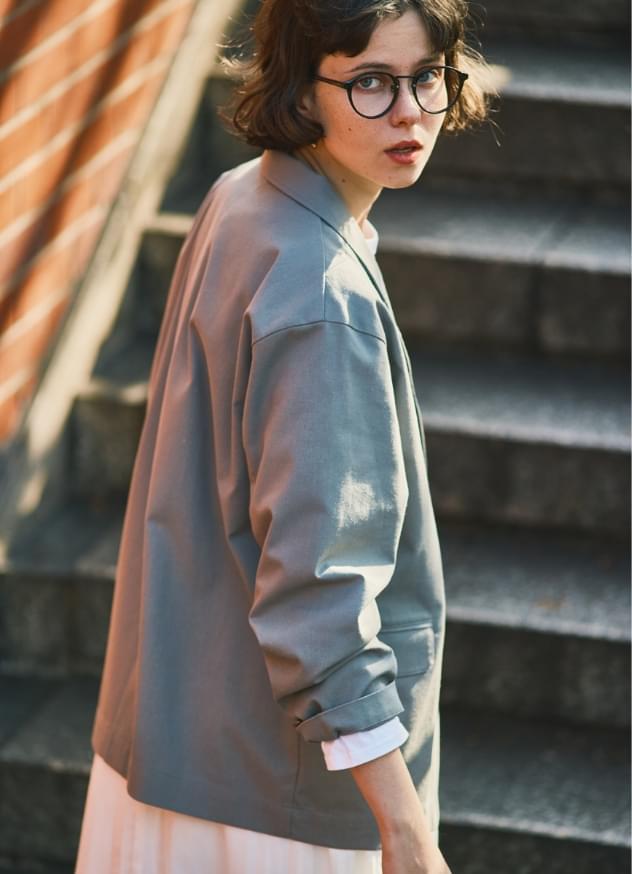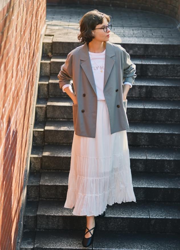 シャツ感覚で羽織れる軽い素材のジャケット。さらっと羽織るだけでコーディネートがまとまる優れもので、気温差のある季節に大活躍の一枚。ロゴプリントのカットソーと甘さのあるスカートを合わせて、シックになりすぎないフェミニンなスタイルに。腕をまくると抜け感が出てこなれた印象で着こなせる。