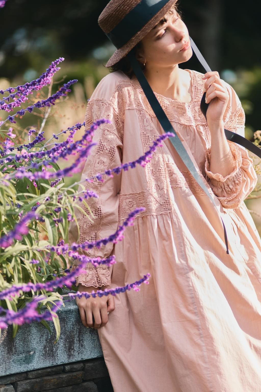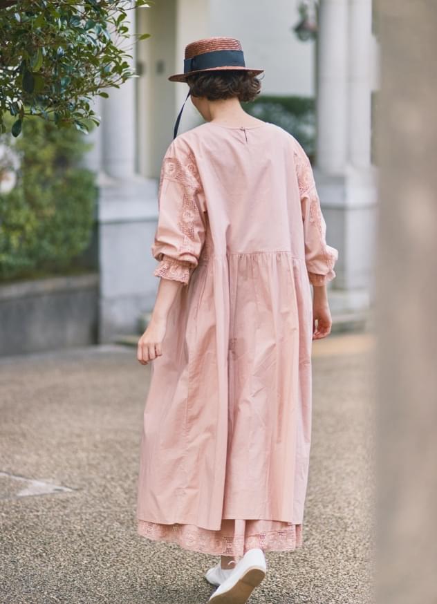 やっぱり、大好きなワンピースがなきゃ春は始まらない。ワンピースとパンツを合わせてワントーンにまとめれば、落ち着いたベージュピンクで甘すぎない雰囲気に。首元をすっきり見せてくれるスクエアネック、凝ったレースのデザイン。ときめきの詰まった春のスタイルを楽しんで。