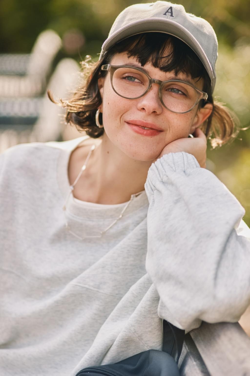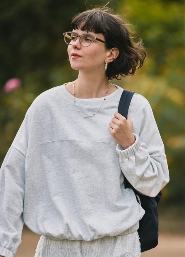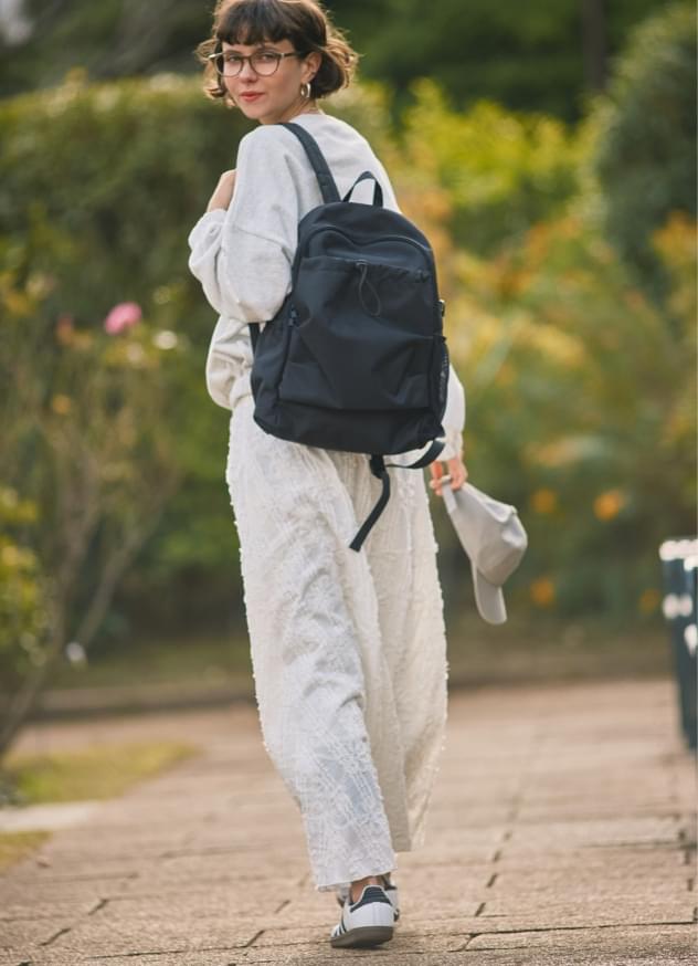 ラフになりすぎない秘密はシルエットや素材感。スウェットは切り替えのデザインと、袖口とすそのギャザーでアクセントのあるシルエット。立体的な模様で素材感が楽しいスカートを合わせて。スニーカーにキャップ&リュックでも、きれいめにまとめるにはきらり光るアクセをプラスするのがおすすめ。