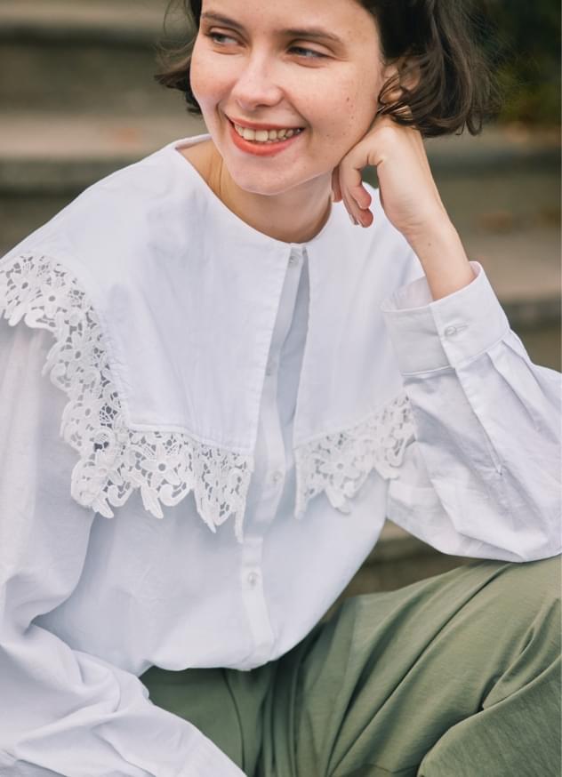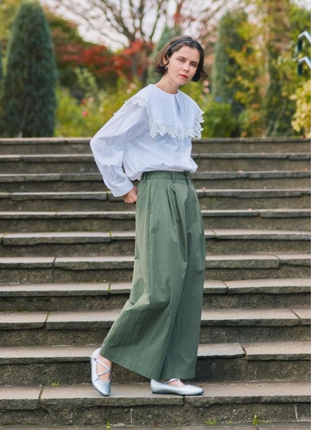レースのついた大きなセーラーカラーが存在感大。フロントや袖周りはシンプルにスッキリとしたデザインの引き算で大人のセーラーに。合わせるのは、脚のラインが出ない張り感のある生地のワイドタックパンツ。ほんのりワーク風のカラーを選べばカジュアルなムードにまとまる。