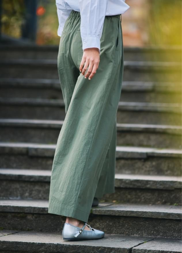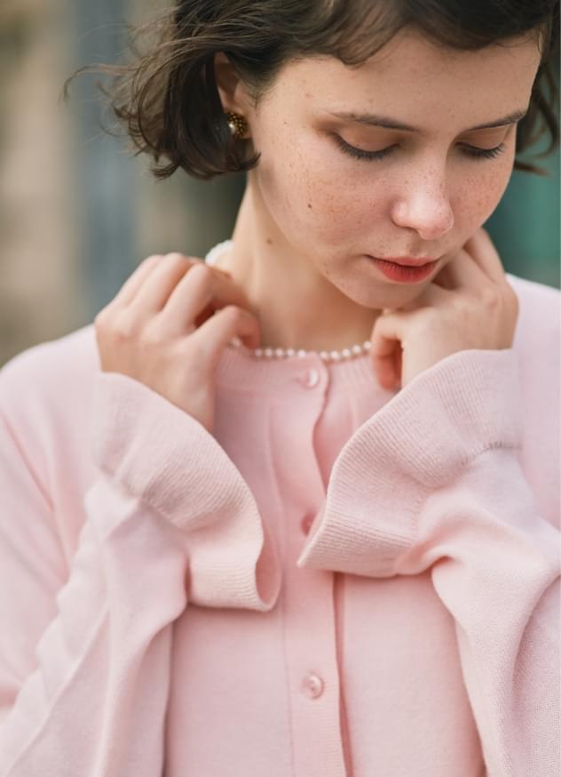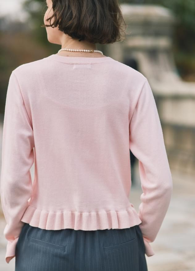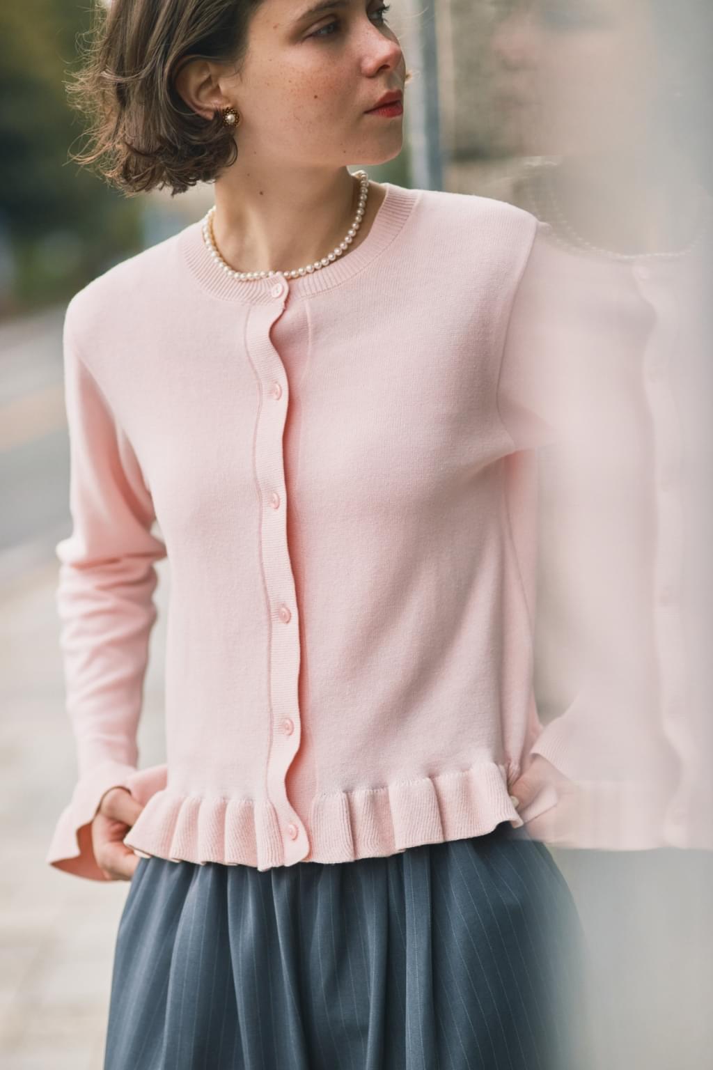 袖と裾がフリルになったハイゲージのカーディガンは前を閉じてシンプルに着こなすのが今の気分。楽な着心地で脚のシルエットをカバーしてくれるパンツはデイリースタイルの強い味方。フラットシューズを合わせて、ちょっぴりクラシックな甘辛MIXで大人ガーリーに。