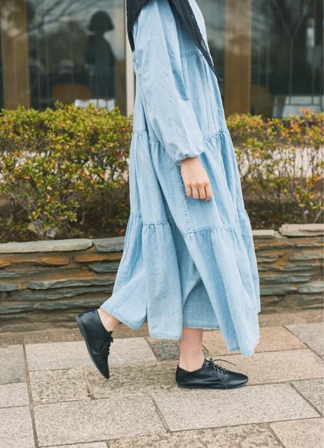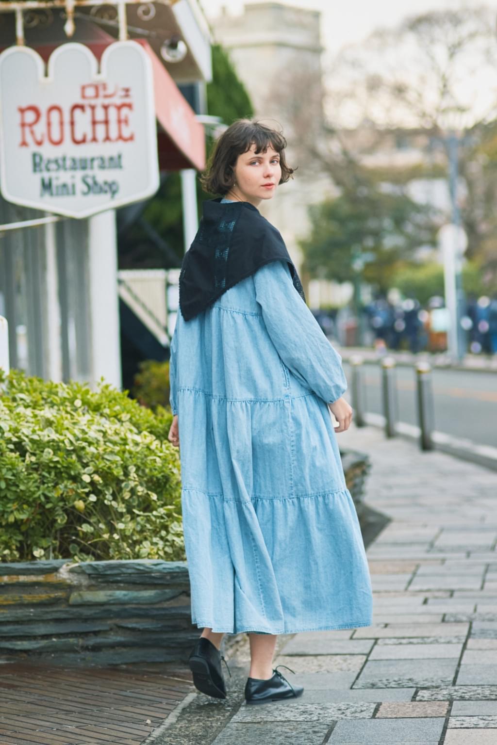 軽いデニム素材のワンピースはティアードデザインでドラマチックな広がり。1枚着るだけでサマになるこだわりのシルエットに注目。襟元や袖はスッキリ、前開きなのでレイヤードも楽しめる。レース素材との相性も良いので、ポイントにストールをプラスするのも今年らしい。