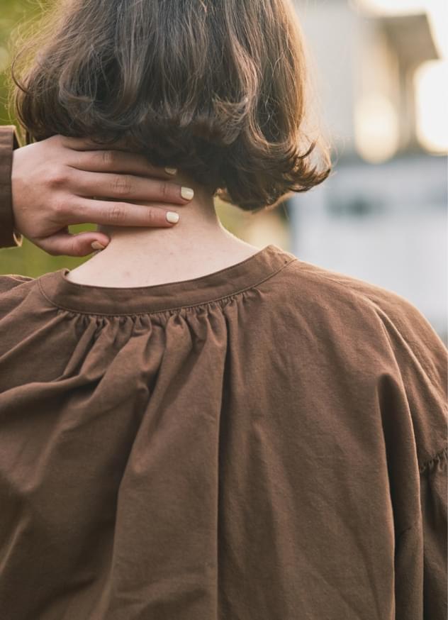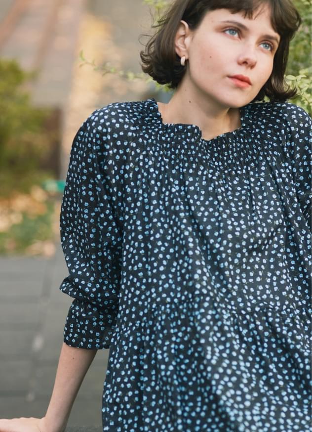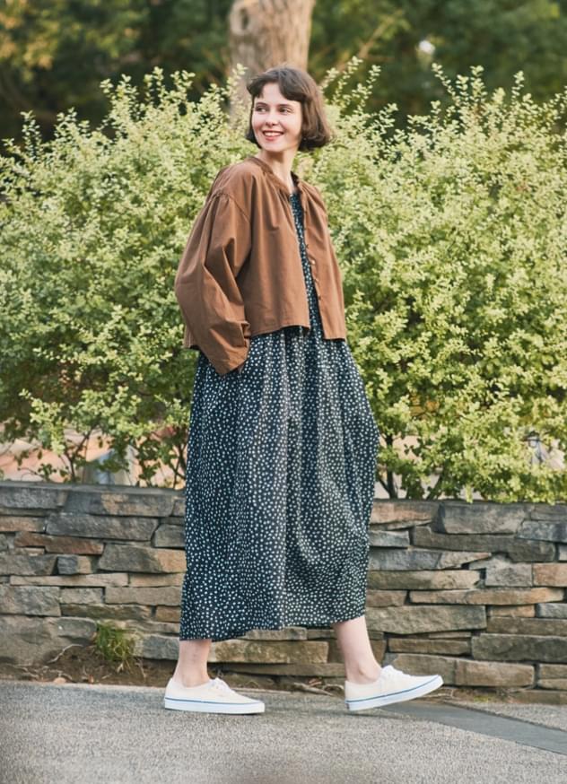 大人の花柄はシックなトーンでまとめるのが◎。黒地に抽象的なブルーの小花柄はシックだけれど存在感がある。首周りはシャーリングのスモックになっていて、顔周りがさりげなく華やかに。ブラウンのジャケットを羽織ってダークトーンでまとめて、足元は白のスニーカーで抜け感を出して。