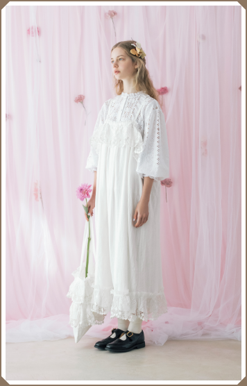 One-piece ¥20,900 [tax incl.] white Blouse ¥18,700[tax incl.] white Bag ¥11,990 [tax incl.] white