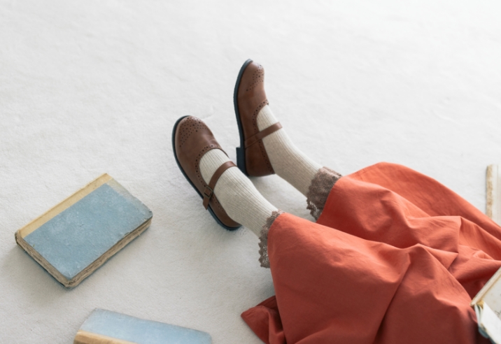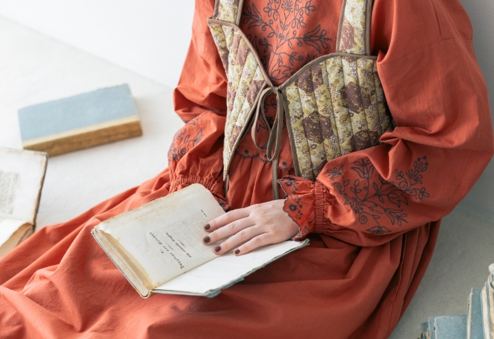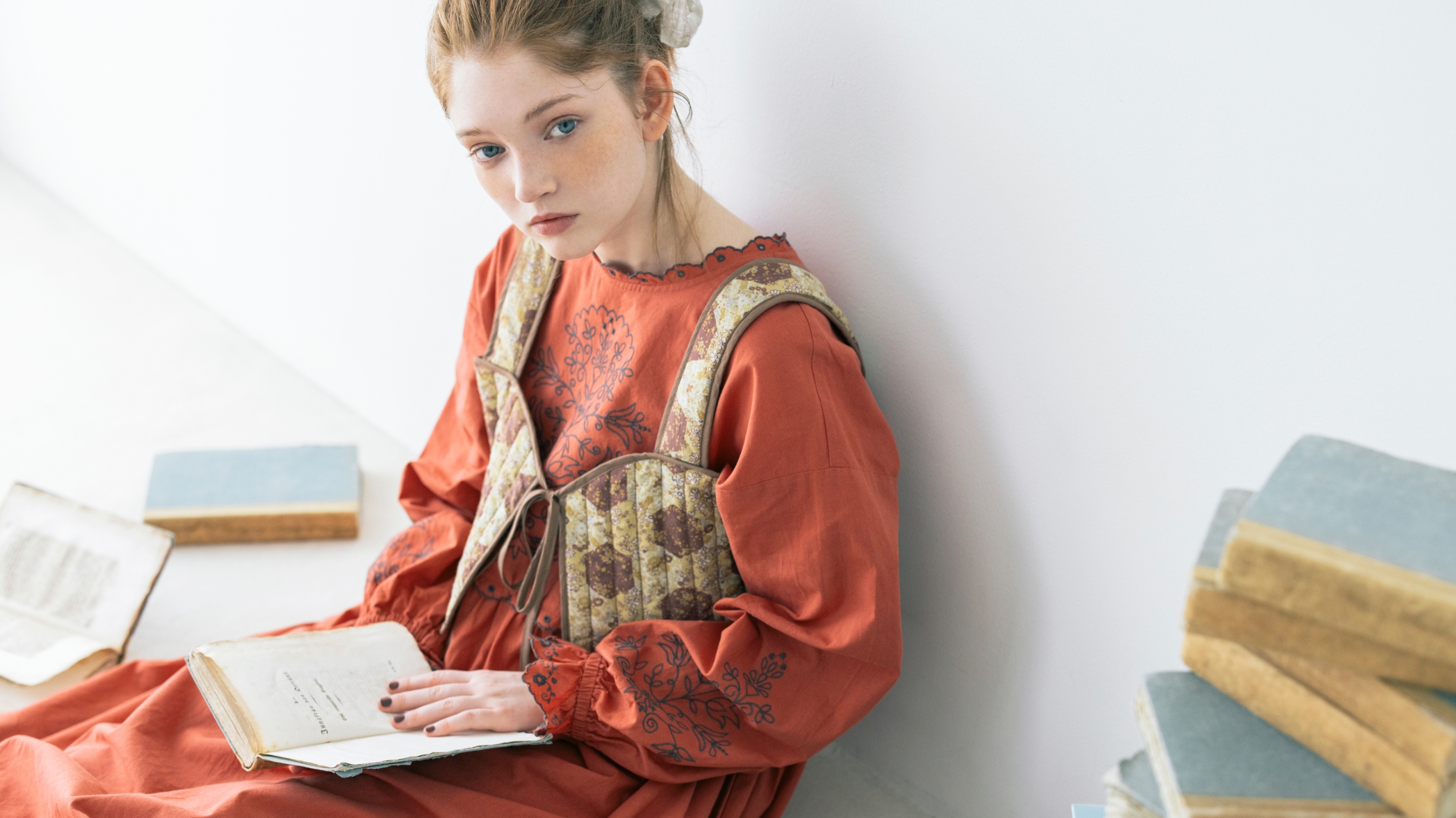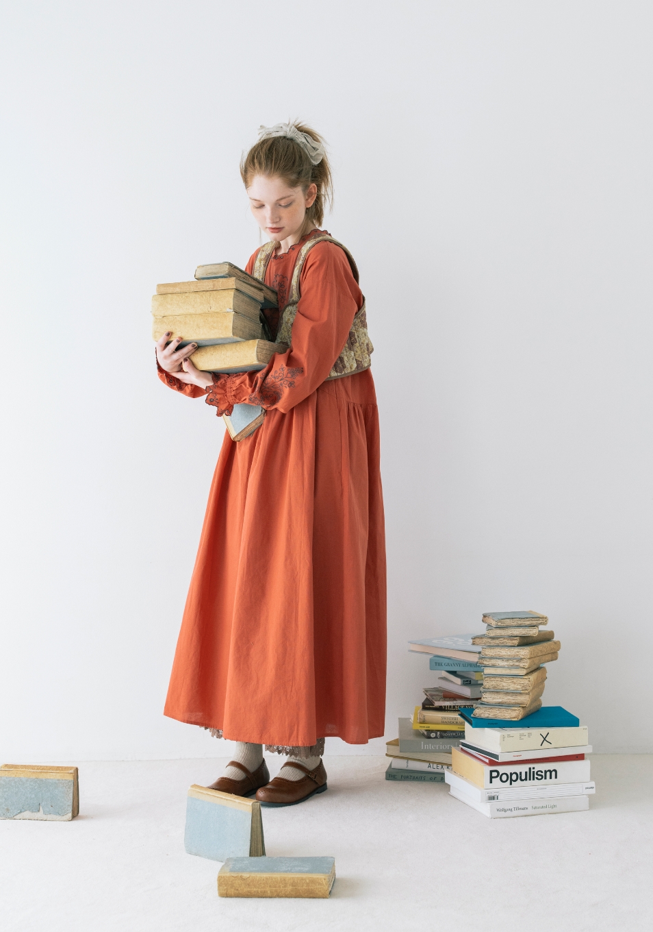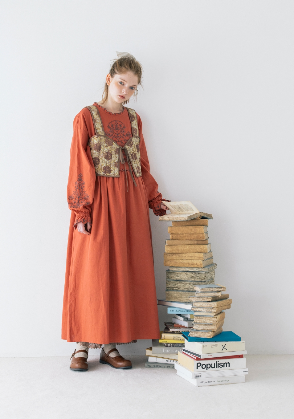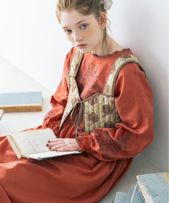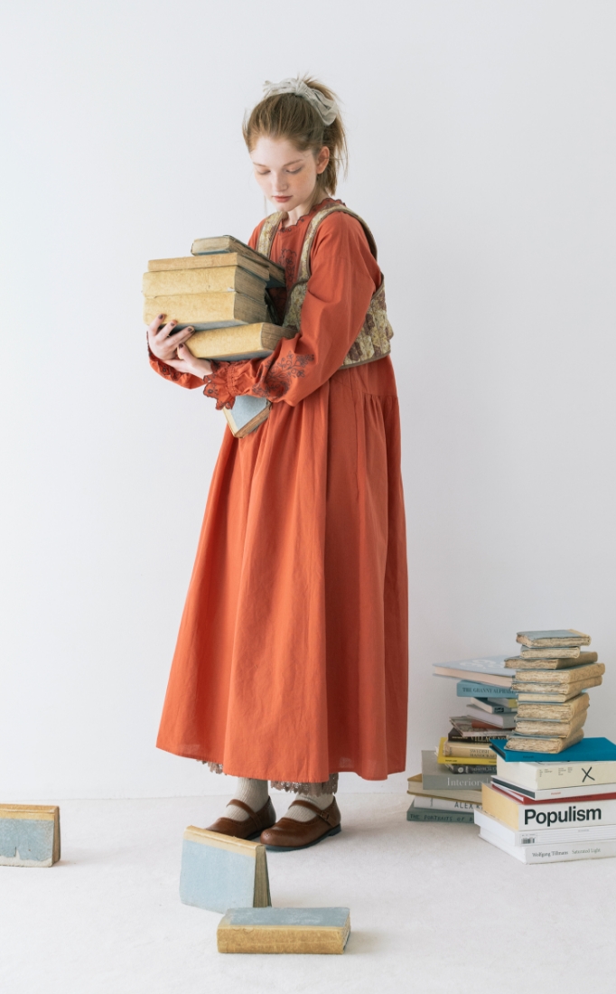 今日は資料を探しに図書室へ。つい気になる本を手に取ってしまいがち。宿題と向き合うにはお気に入りの赤いワンピースで気分を上げて。クラシックな柄のビスチェを合わせたのが今日のポイント。