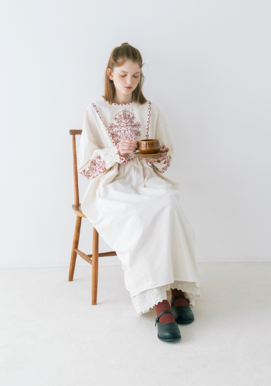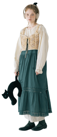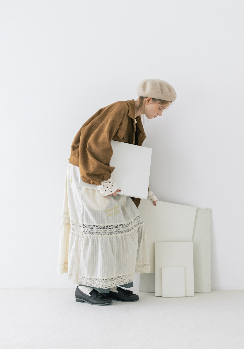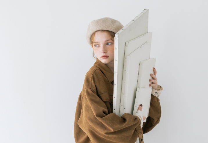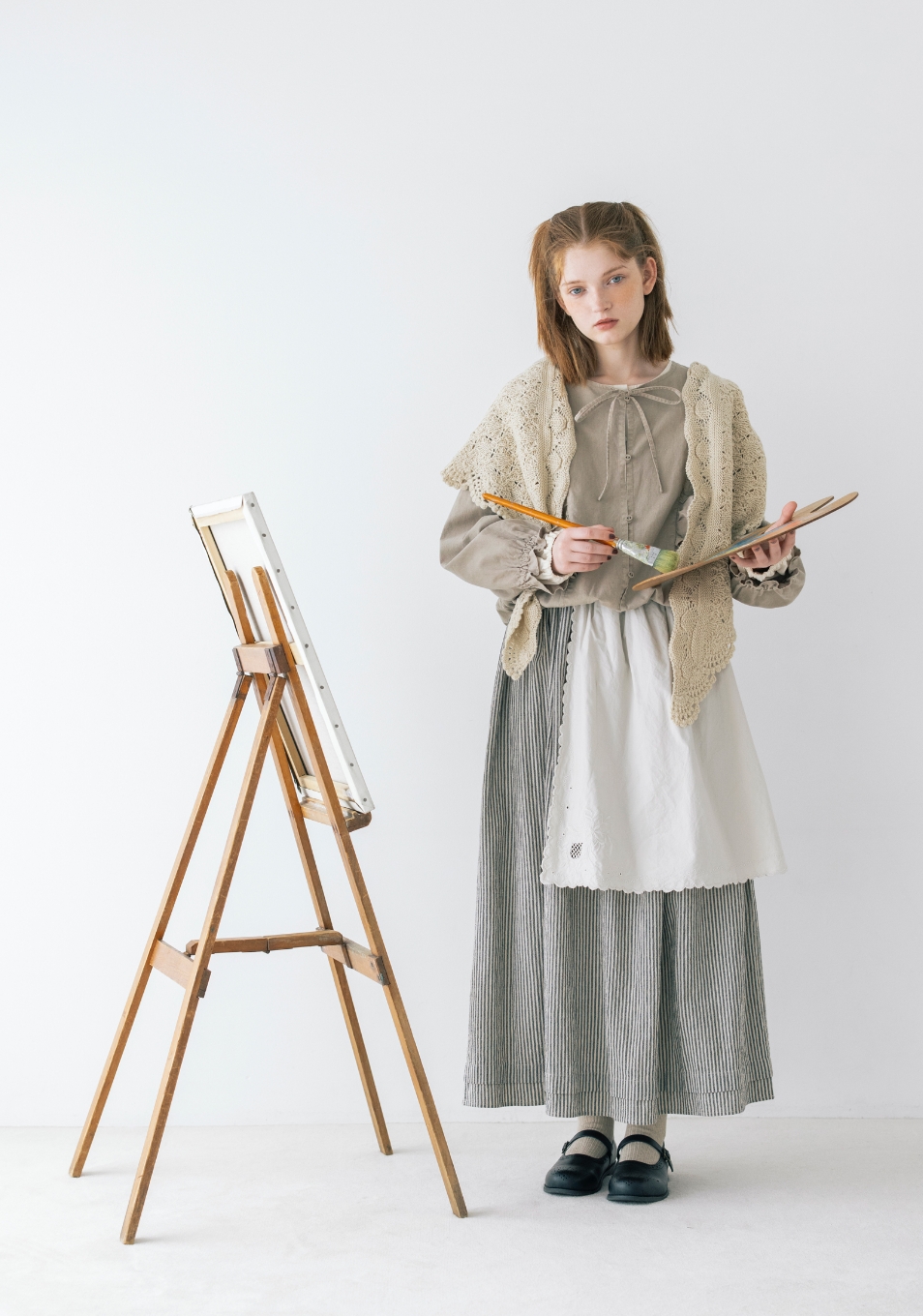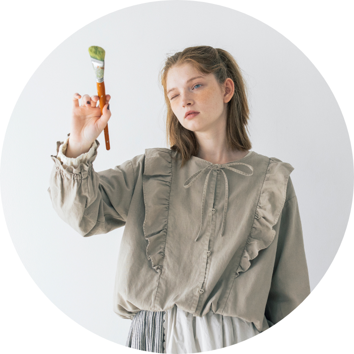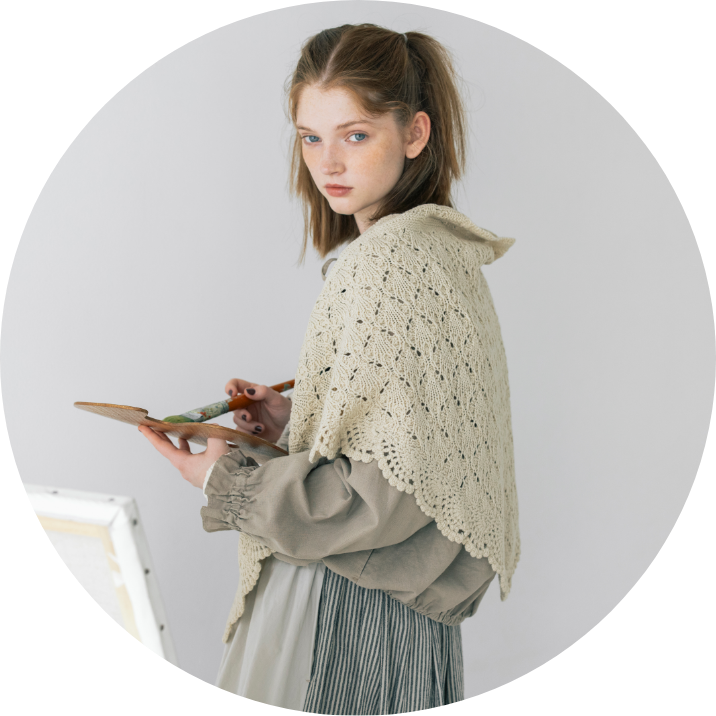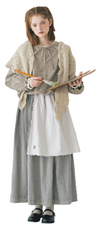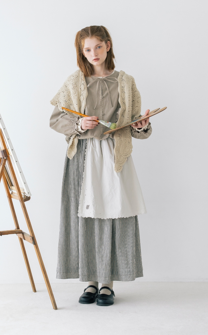キャンバスを自分の色で埋めていく。描くことに集中したいから心が落ち着く優しいニュアンスの服を選んだ。リボン、レース、エプロンとショール。好きなものを重ねると自分らしさが見えてくる。