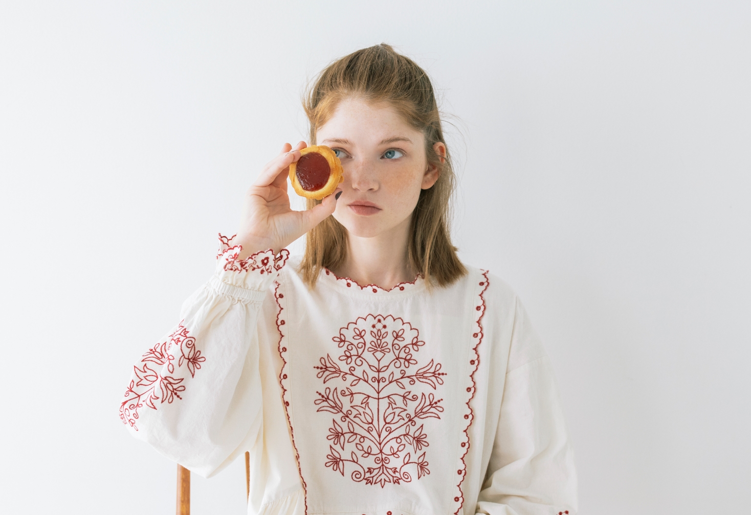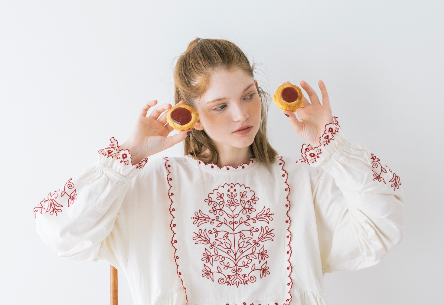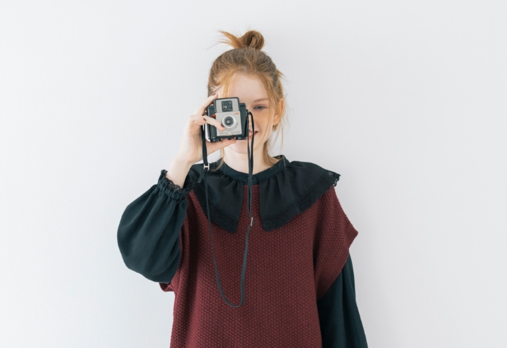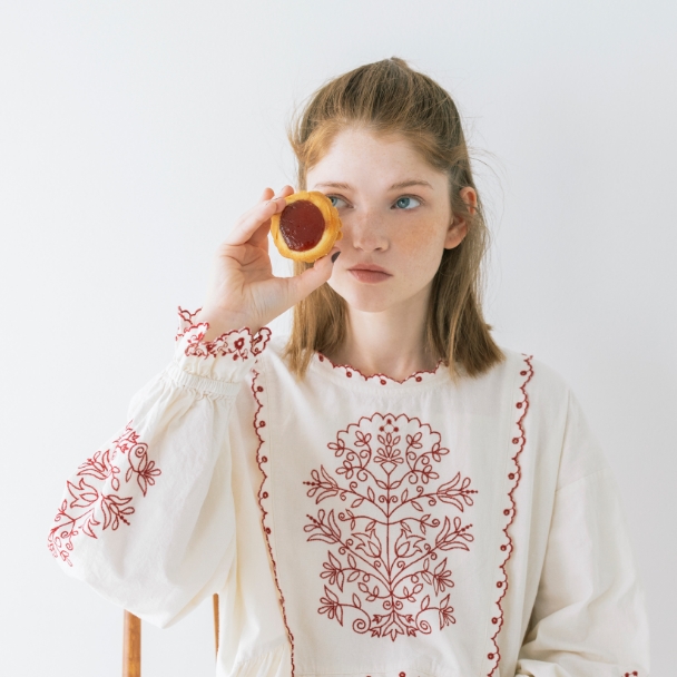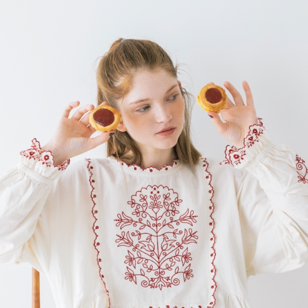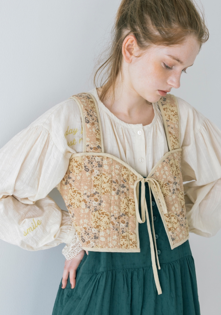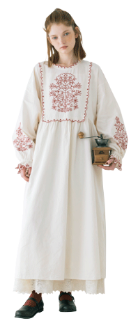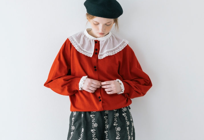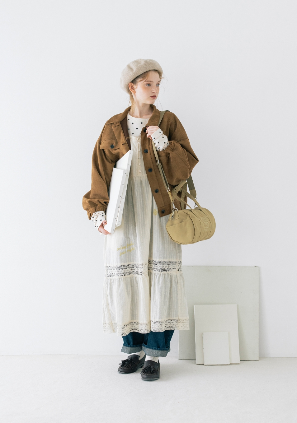 キャンバスを自分の色で埋めていく。描くことに集中したいから心が落ち着く優しいニュアンスの服を選んだ。リボン、レース、エプロンとショール。好きなものを重ねると自分らしさが見えてくる。