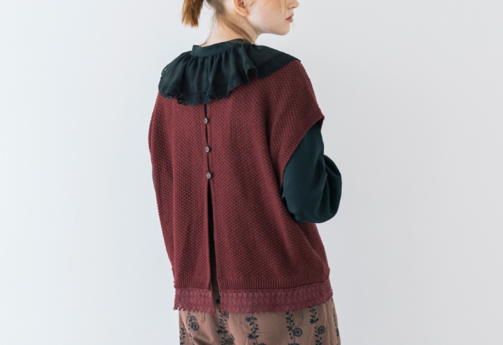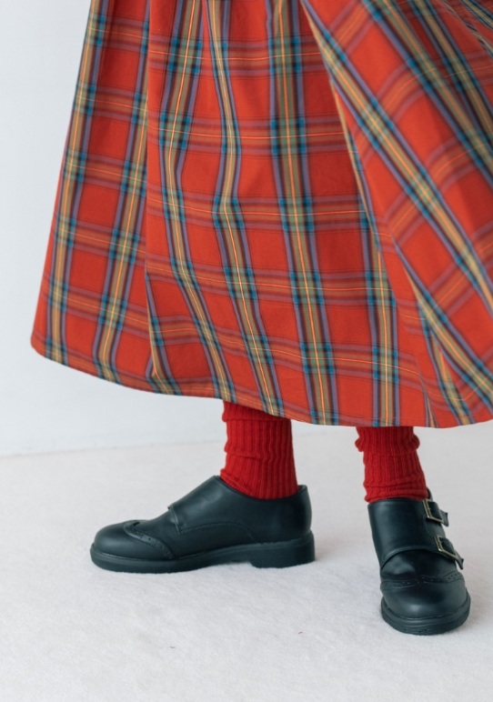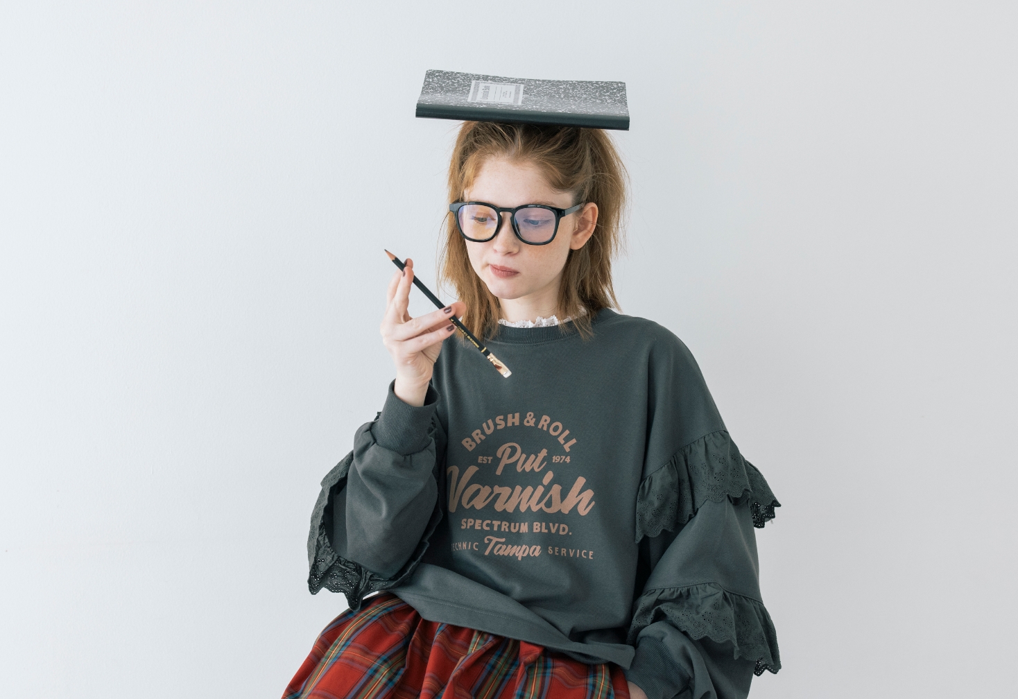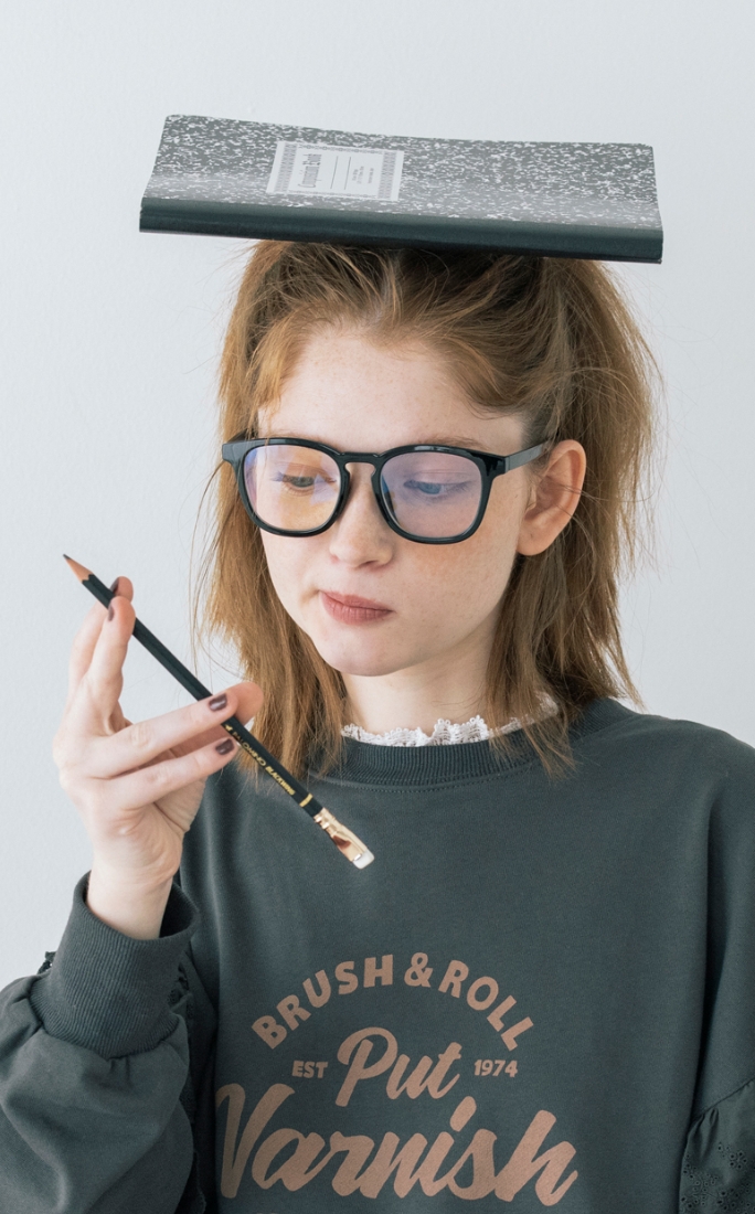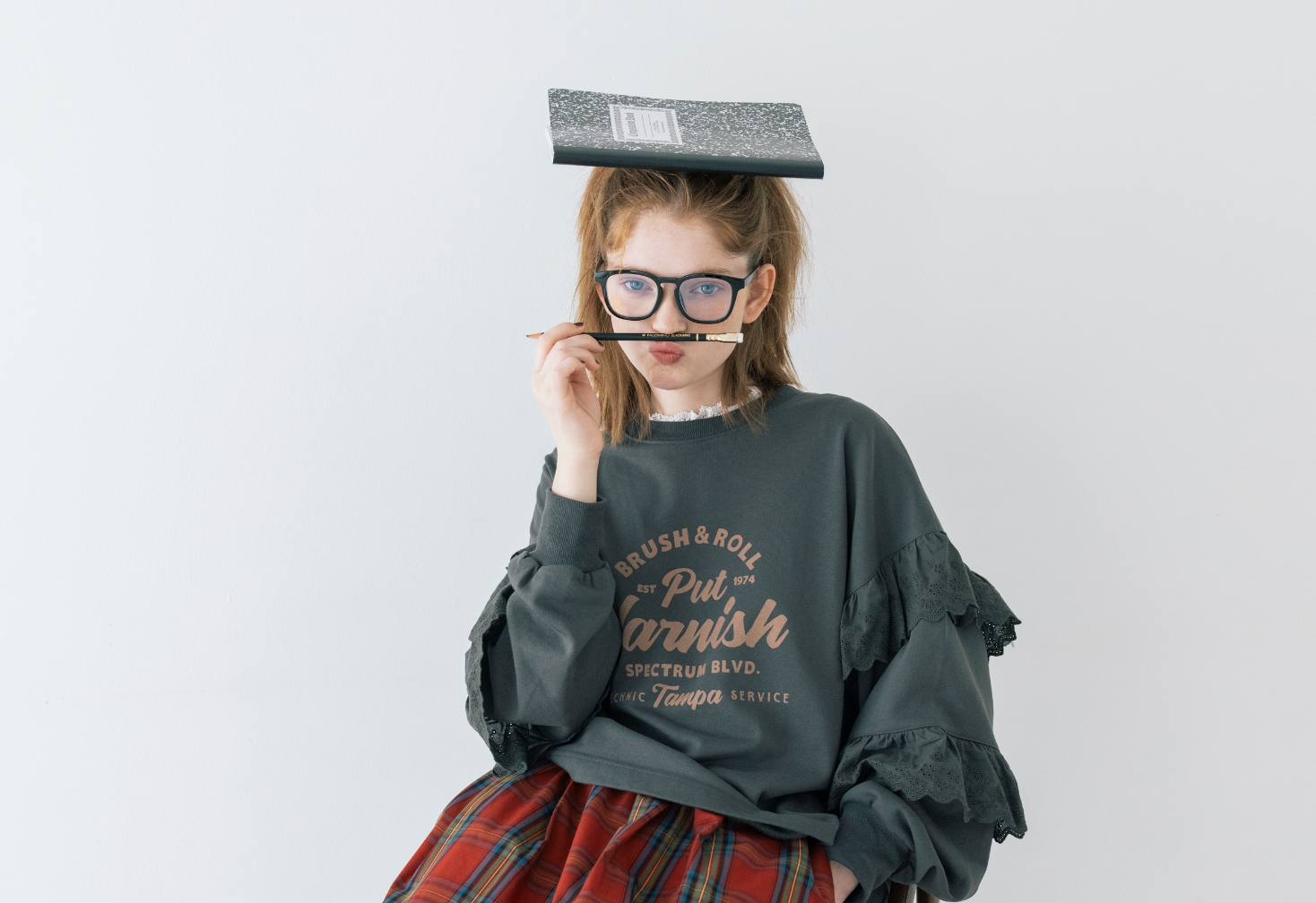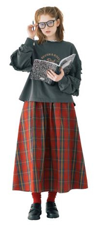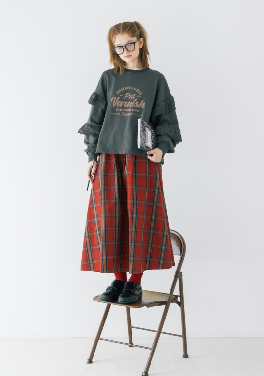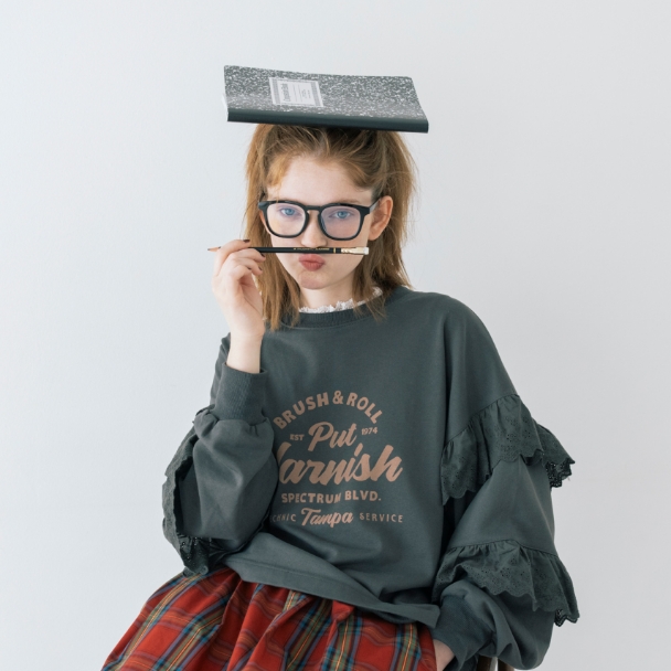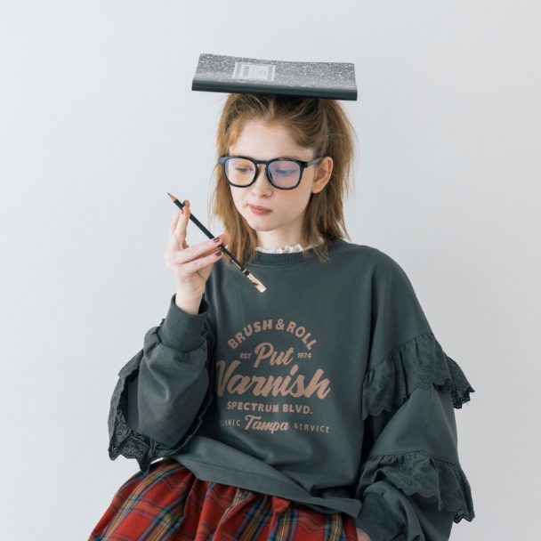 授業はメガネで真面目モードだけど、ちょっと飽きて来ちゃう。赤いチェックのスカートと、カレッジ風のロゴでスクールガールを気取ってみる。定番に見えて袖のレースが一味違うでしょ?