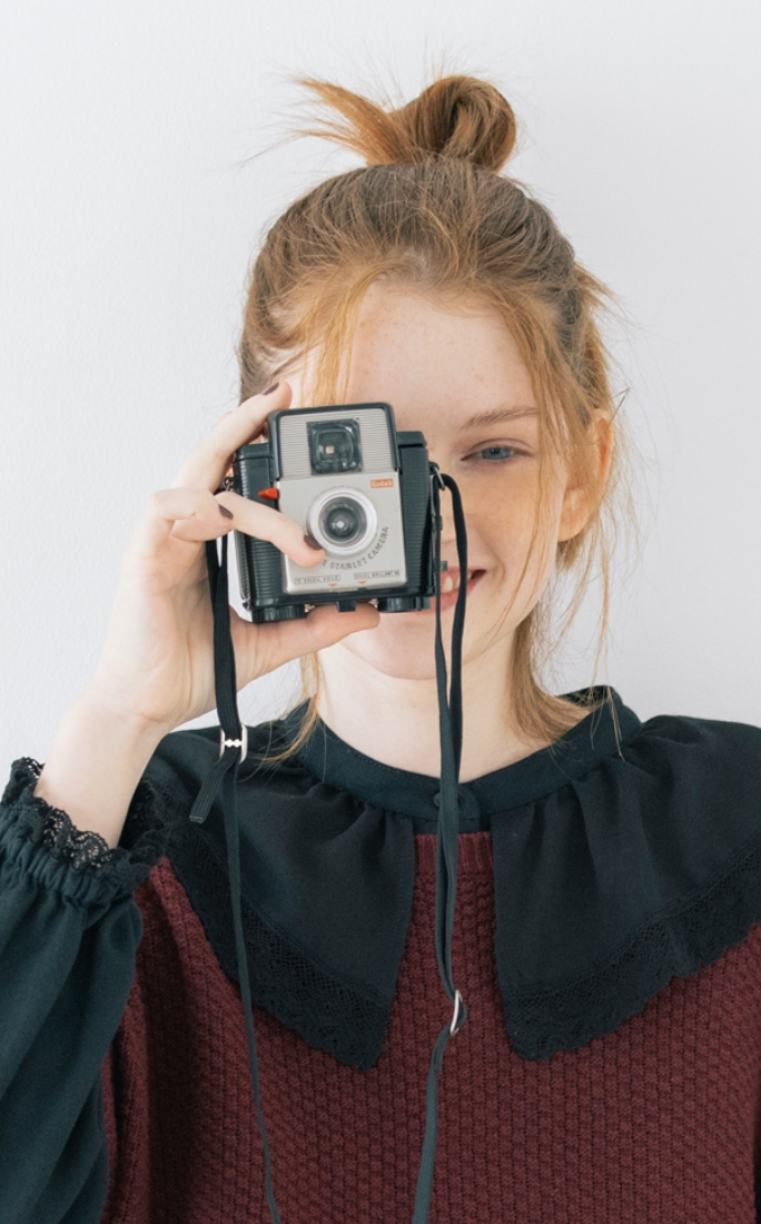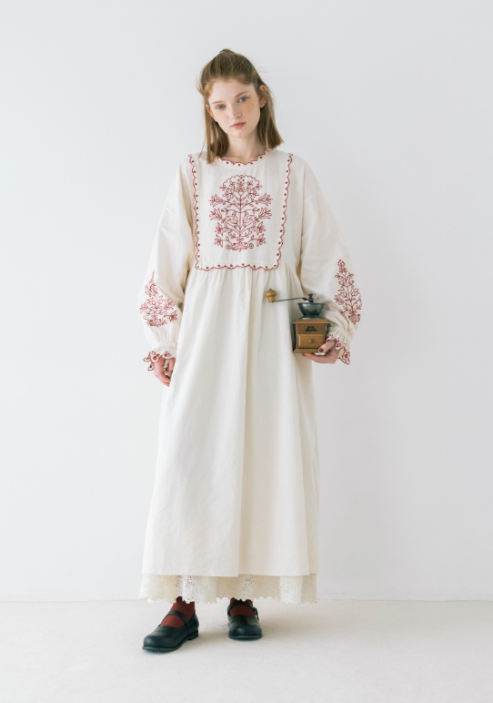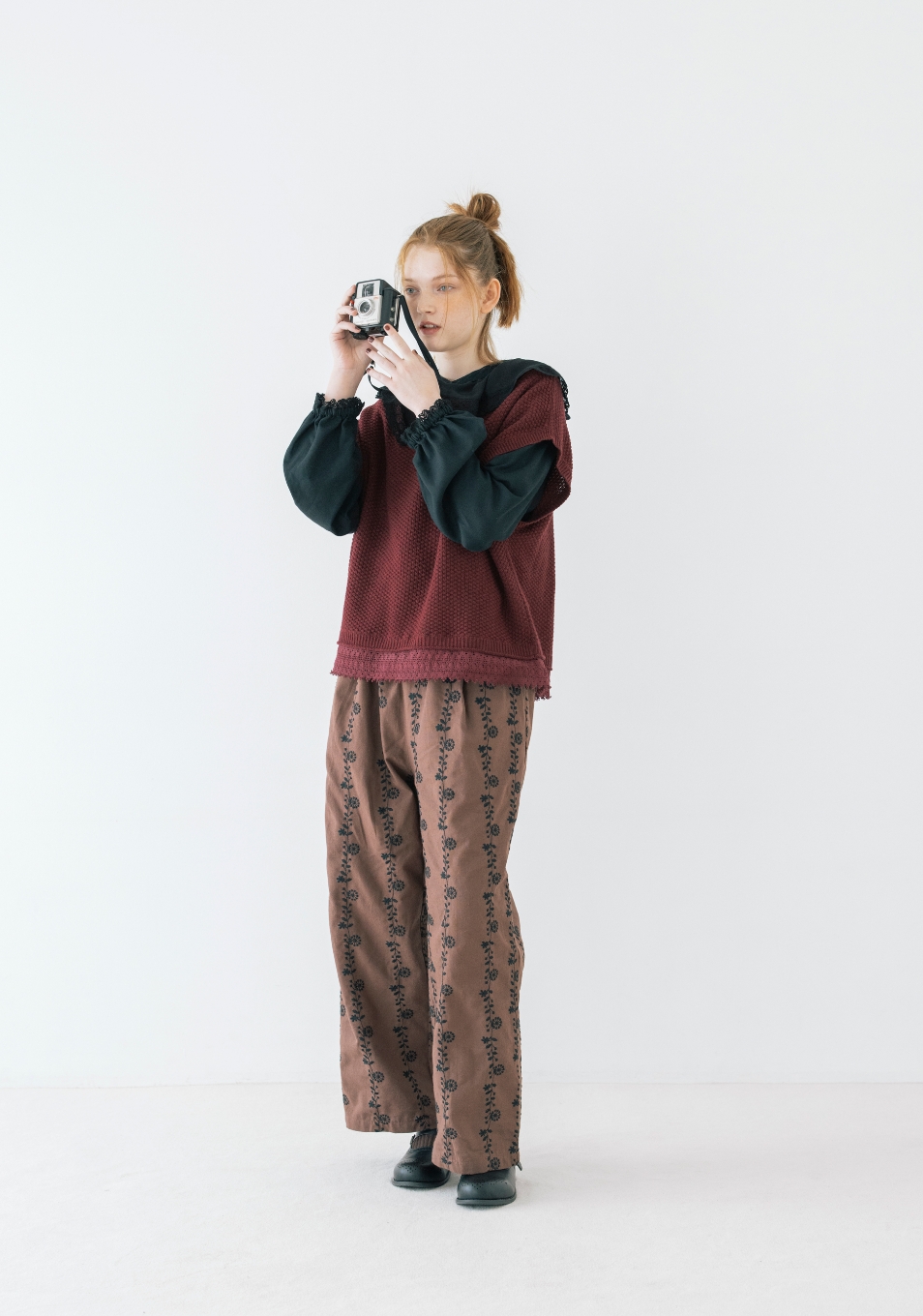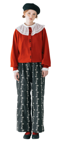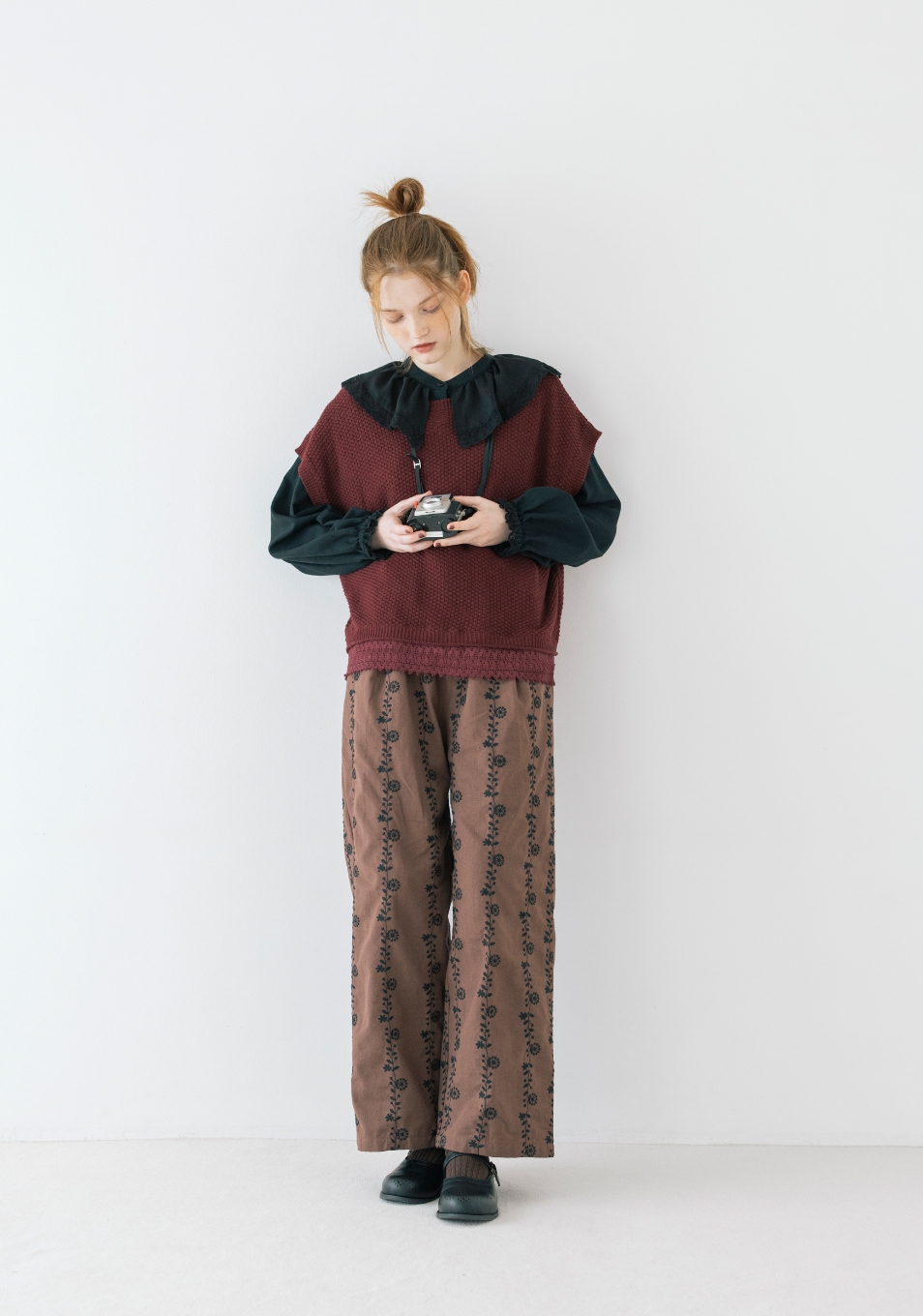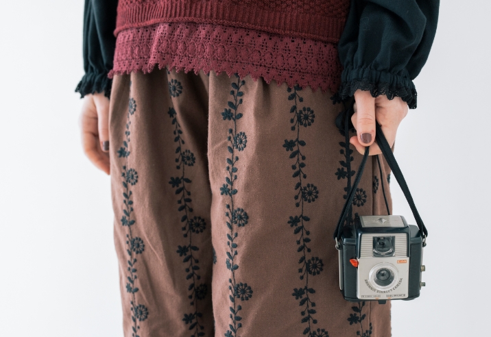 作品作りの参考に街中で気になるあれこれを写真に撮る。あちこち歩きまわるからパンツがちょうどいい。大きな襟や刺繍、大好きなディテールの服を秋の街に似合うダークトーンでまとめて。