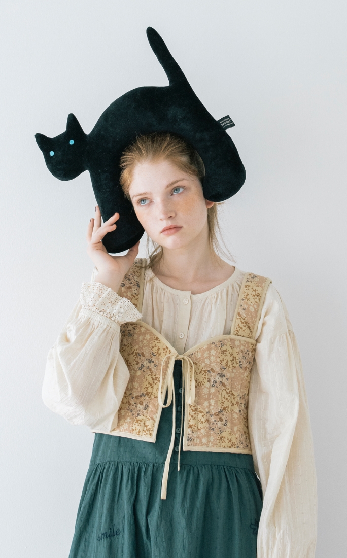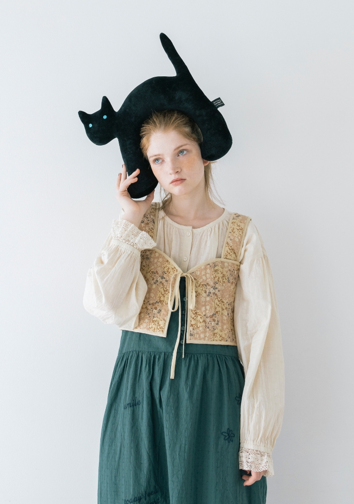 通学のとおり道にいる猫と仲良くなった。自由気ままに過ごしている猫がうらやましい。グリーンのワンピースと、ブラウス、花柄のビスチェを重ねて、私らしい自由気ままなファッションを楽しんでみる。