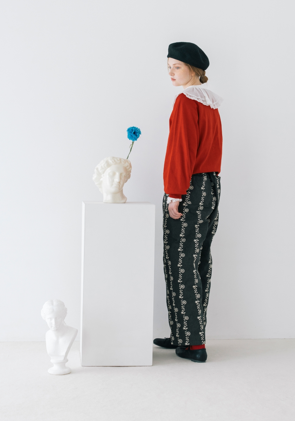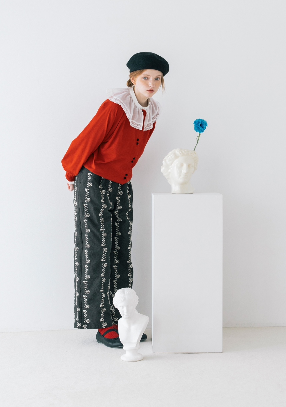 ちょっぴりおめかしをして美術館へ。大きなエリとベレー帽は芸術家のトレードマーク。カーディガンとソックスも赤に合わせたのが小さなこだわり。モノトーンの中に差し色を入れる、コーデもアート目線でね。