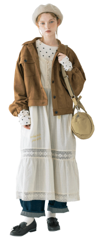 キャンバスを買いに画材屋さんへ。小さな刺繍がチャームポイントのレースのワンピースに、デニムをプラスしてちょっぴりアクティブに。ジャケットもガーリーなふんわりシルエットを選ぶのが私の好み。