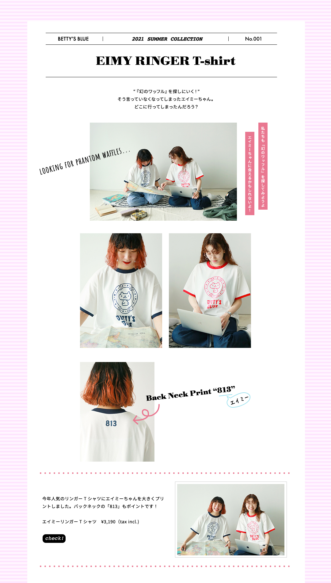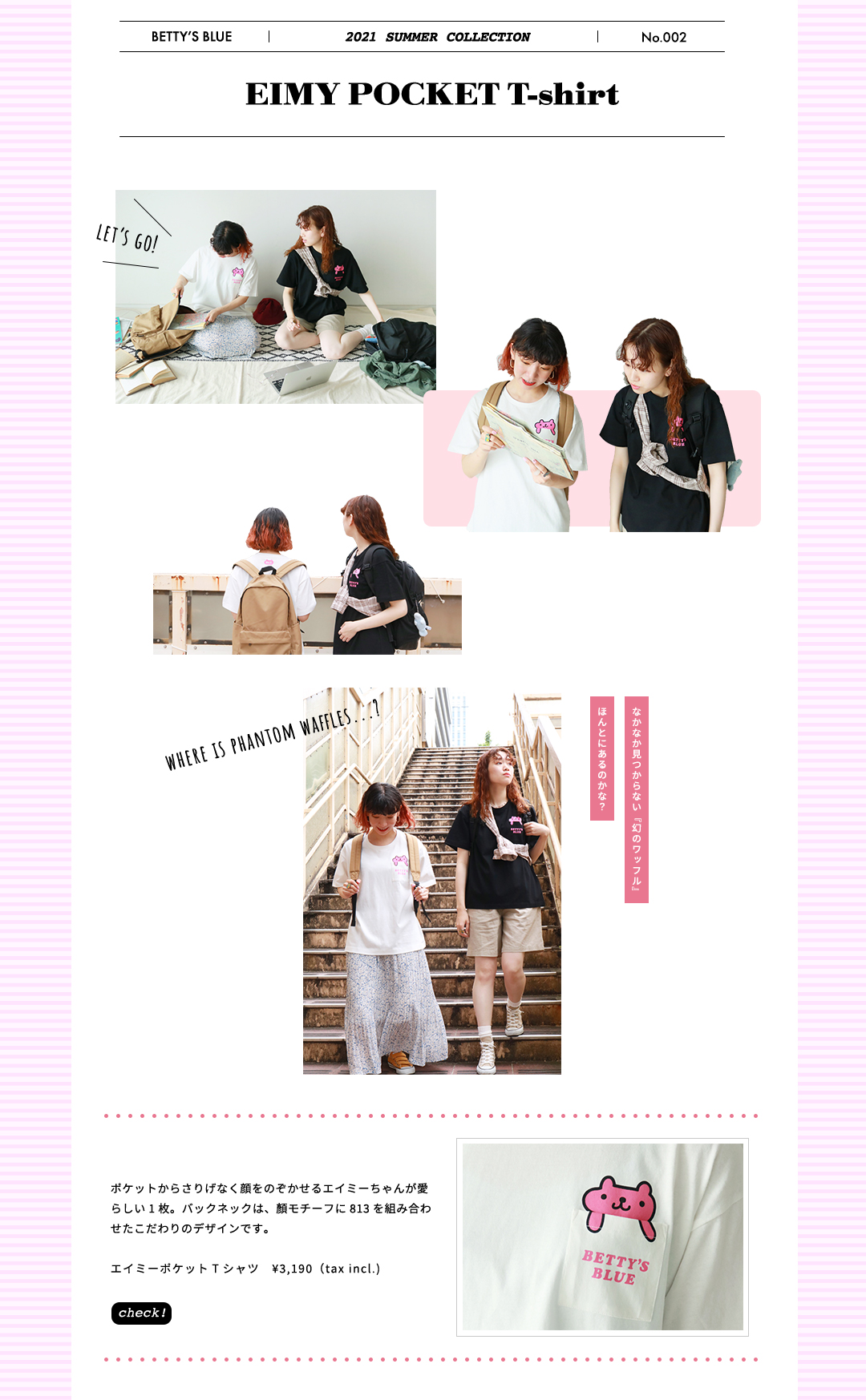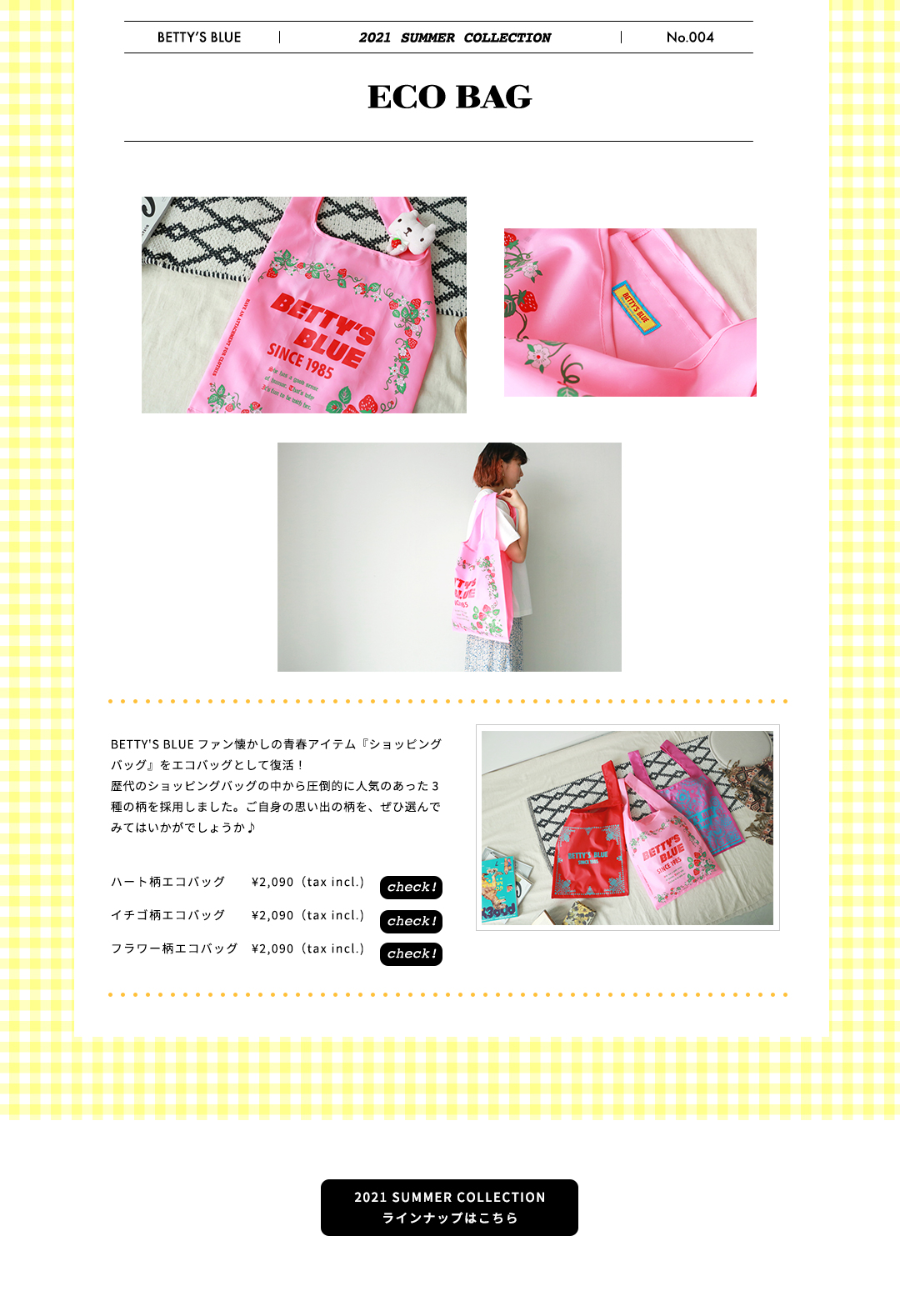 2021年に限定復活した「BETTY’S BLUE」。 大好評につき、第二弾アイテムの発売が決定いたしました! 第二弾は「BETTY’S BLUE」大人気キャラクターのエイミーちゃんがついに登場♪ これからの季節に活躍するTシャツシリーズを発売いたします。 さらに、ブランドのアイコンとして、たくさんの方に愛用いただいた ショッピングバッグがエコバッグとして復活。 ファン必見のアイテムを、お見逃しなく♬