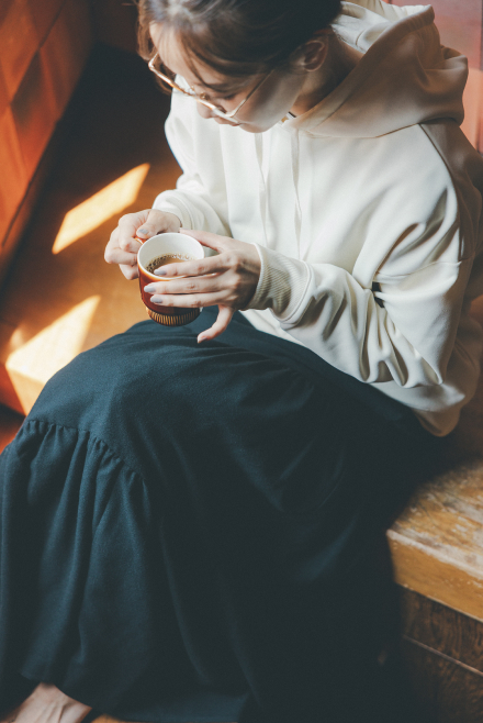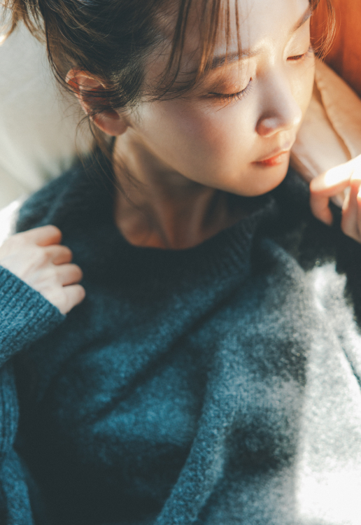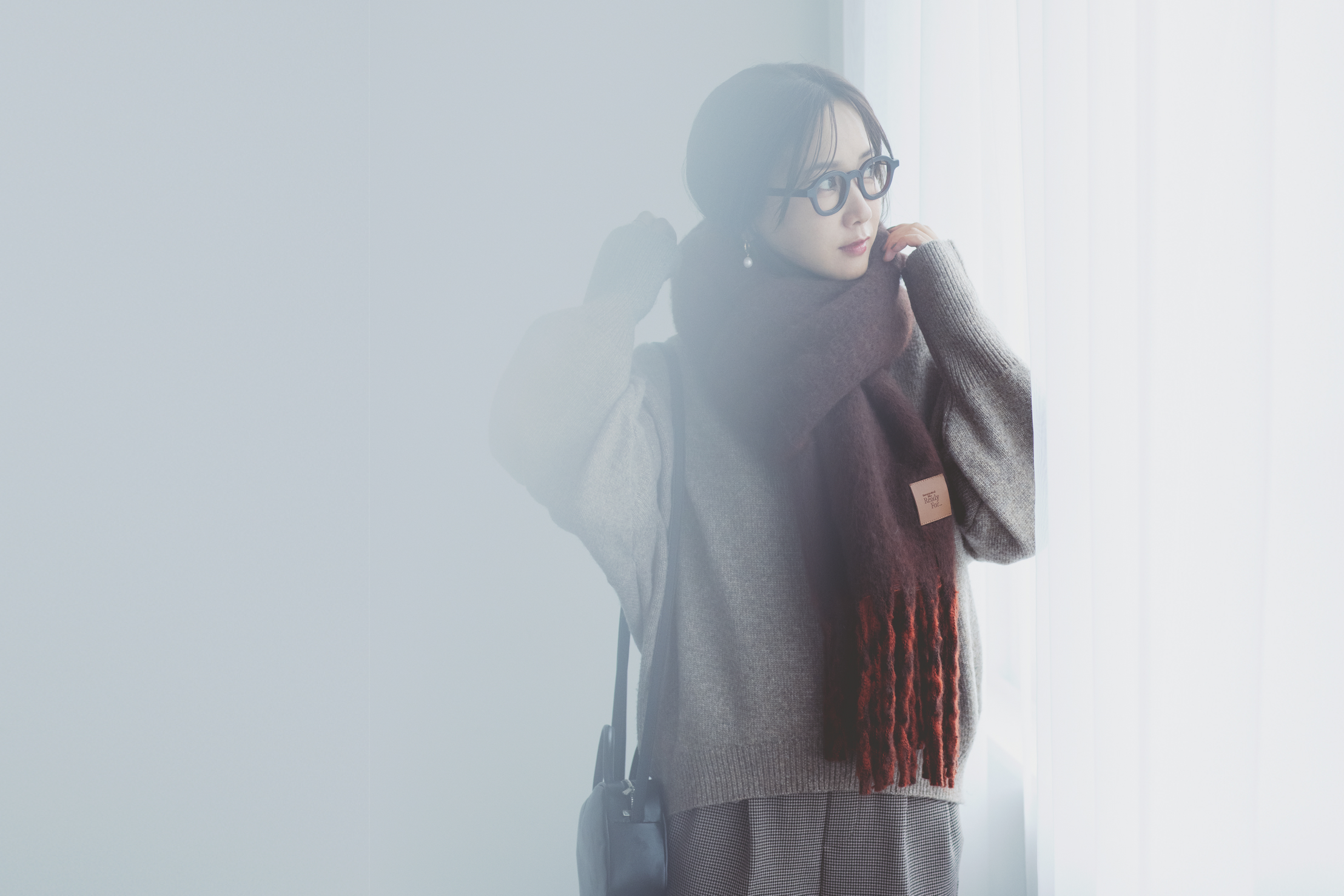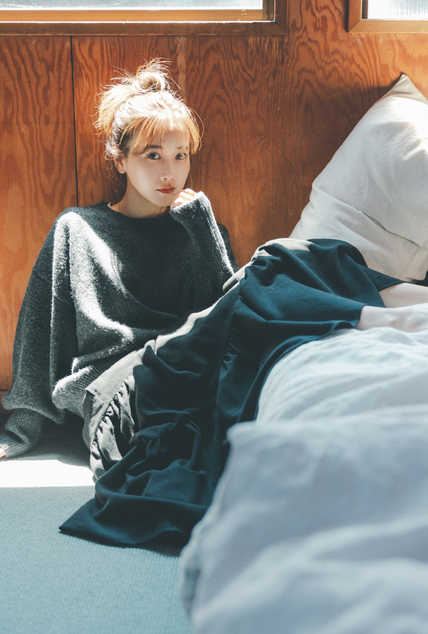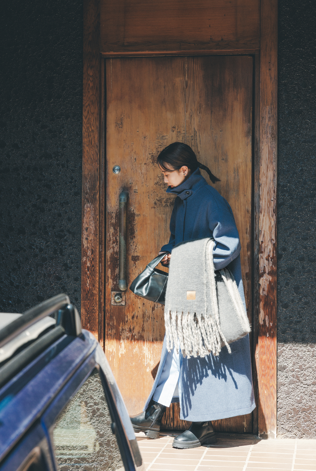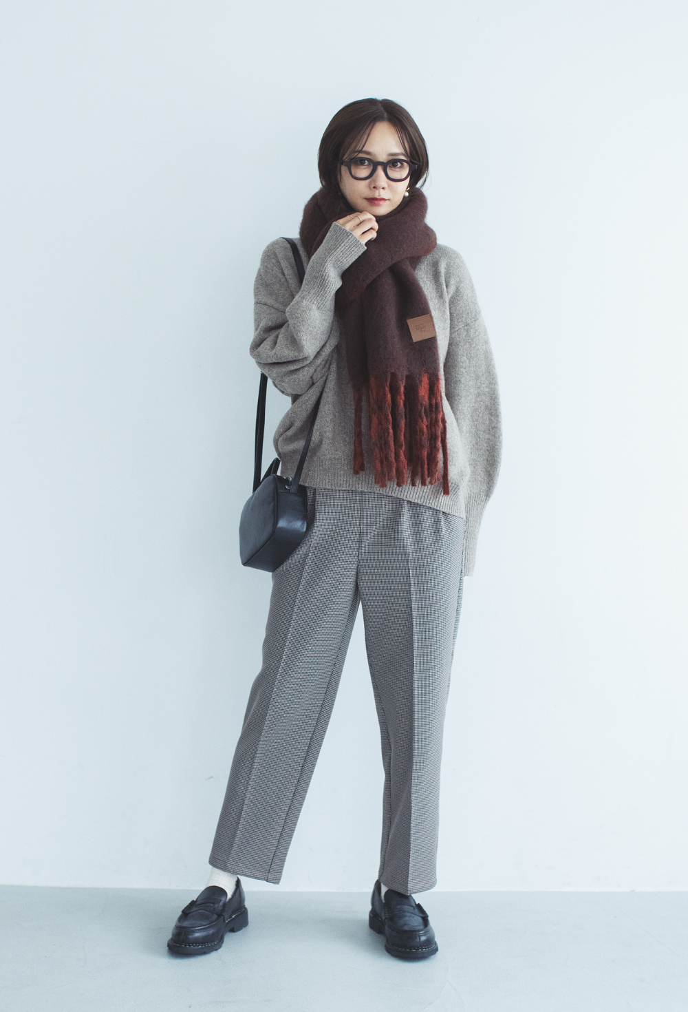 「ニットは、体型を拾わないゆるシルエットながら、すっきり見えるサイズ感。重ね着しても快適に過ごせます」 ミニマムな服だからこそ、袖のデザインやリブの長さといった細部にまで田中さんのこだわりを投入。センタープレスのパンツと合わせた、カジュアルシックな佇まい。