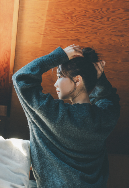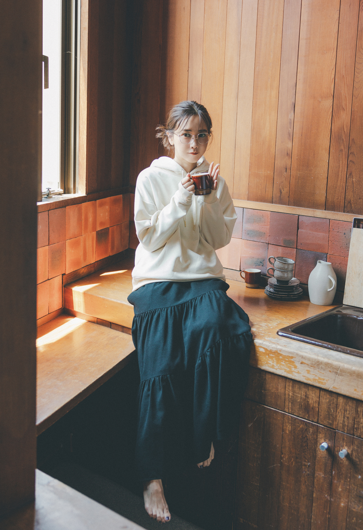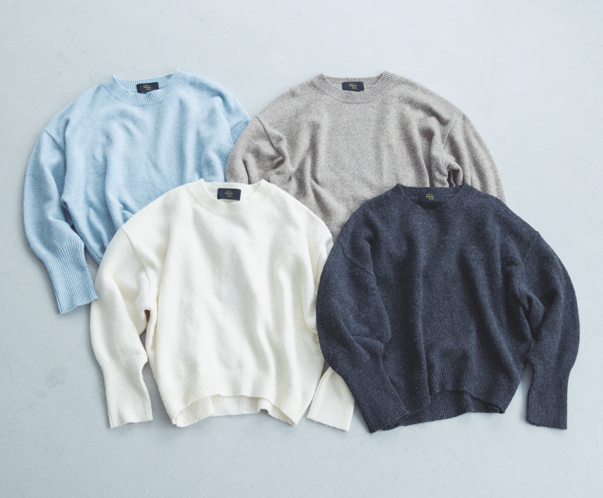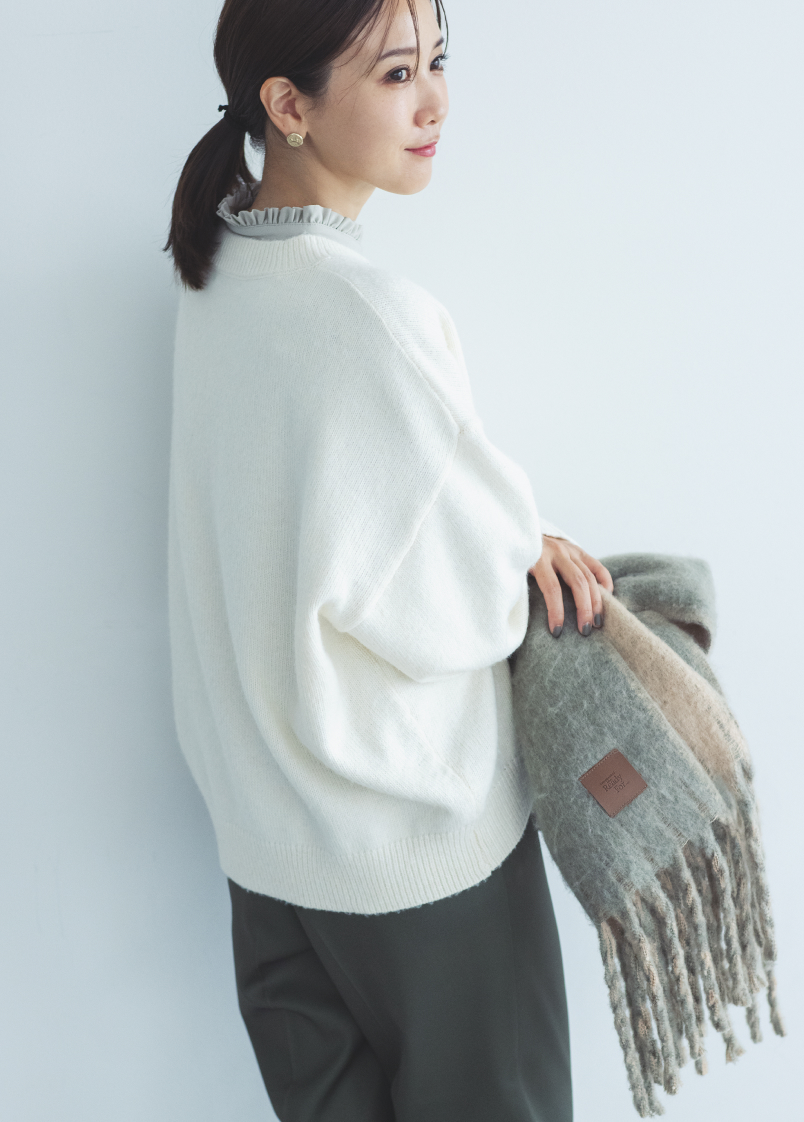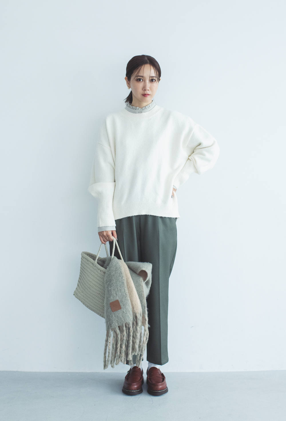ニットプルオーバーのこなれ感のあるダスティカラーを主役に、クリーンな白をポイントで効かせて、軽快さをプラス。「ニットの裾はゆるくラウンドさせて、前後で長さに差をつけたデザインに仕上げています。どんなボトムと合わせても、簡単にバランスよく着こなせます」