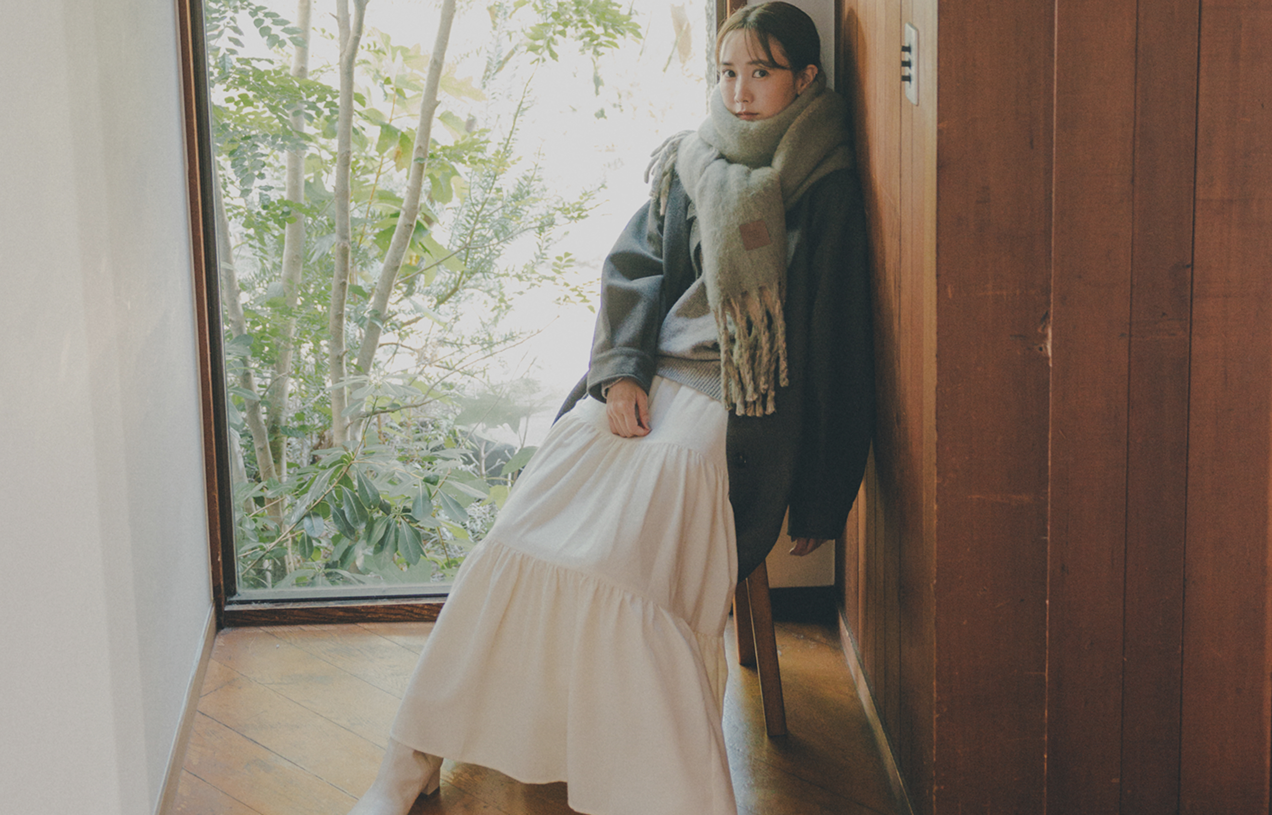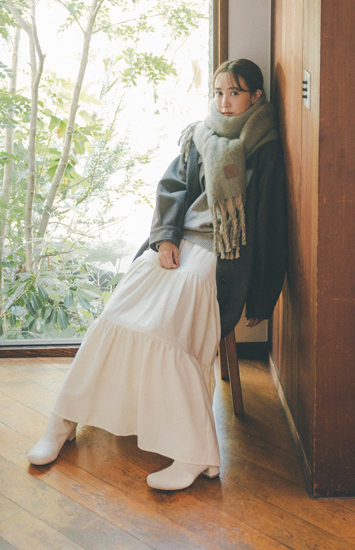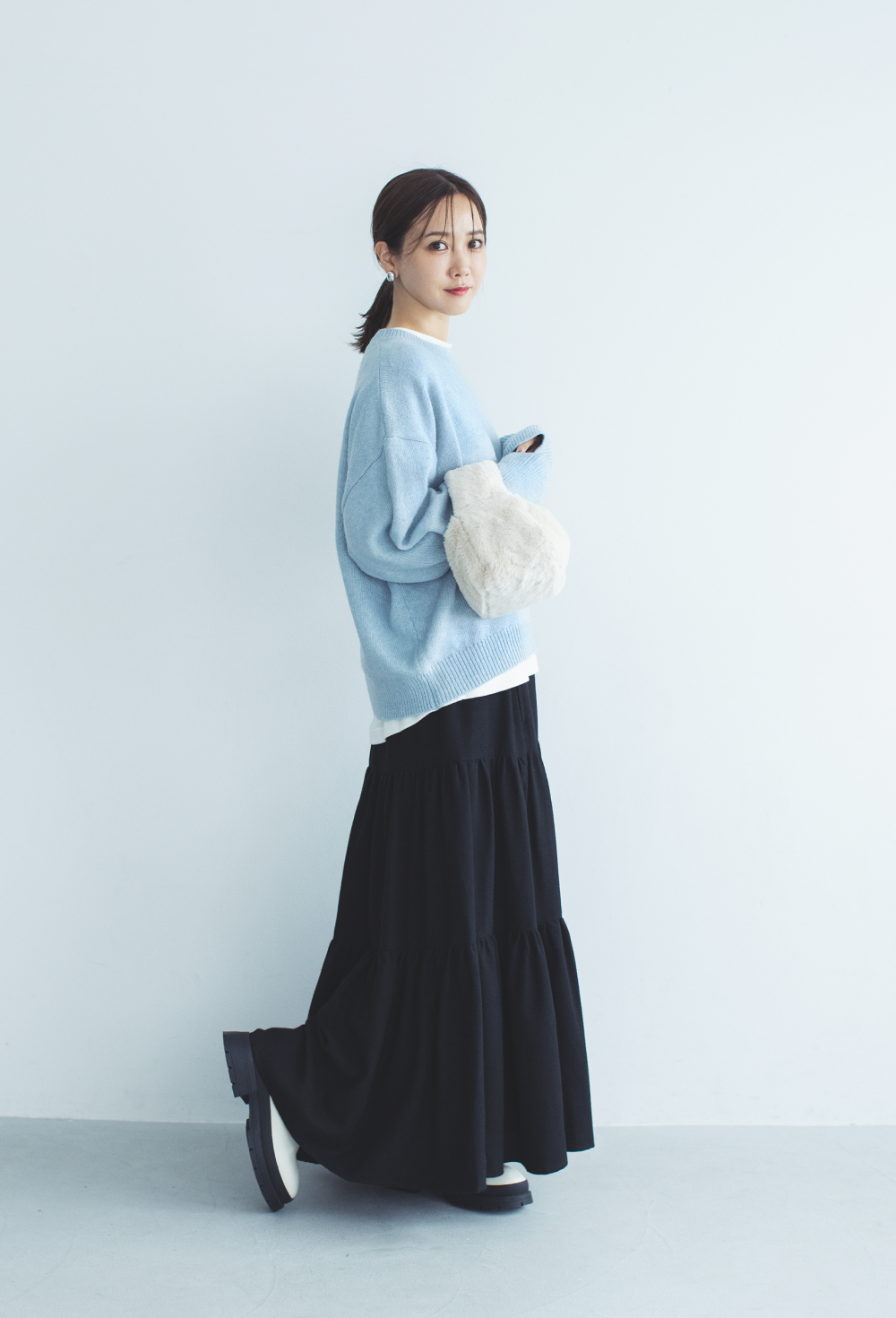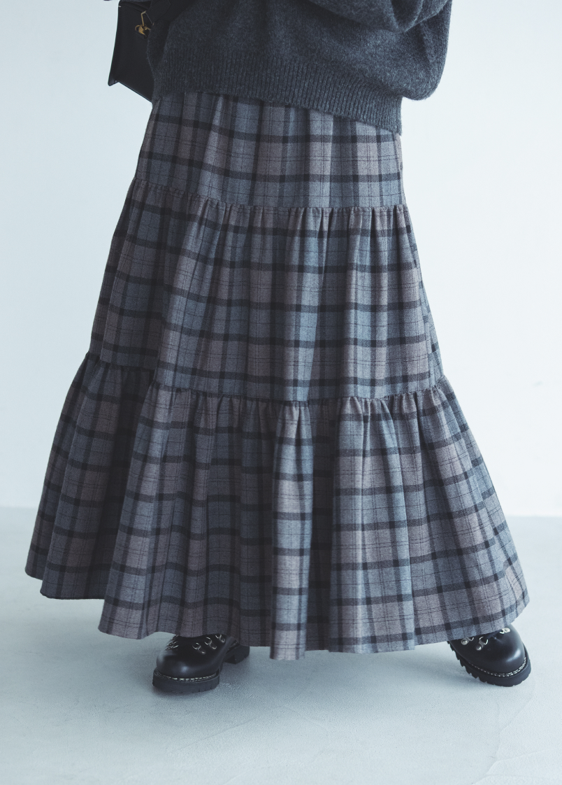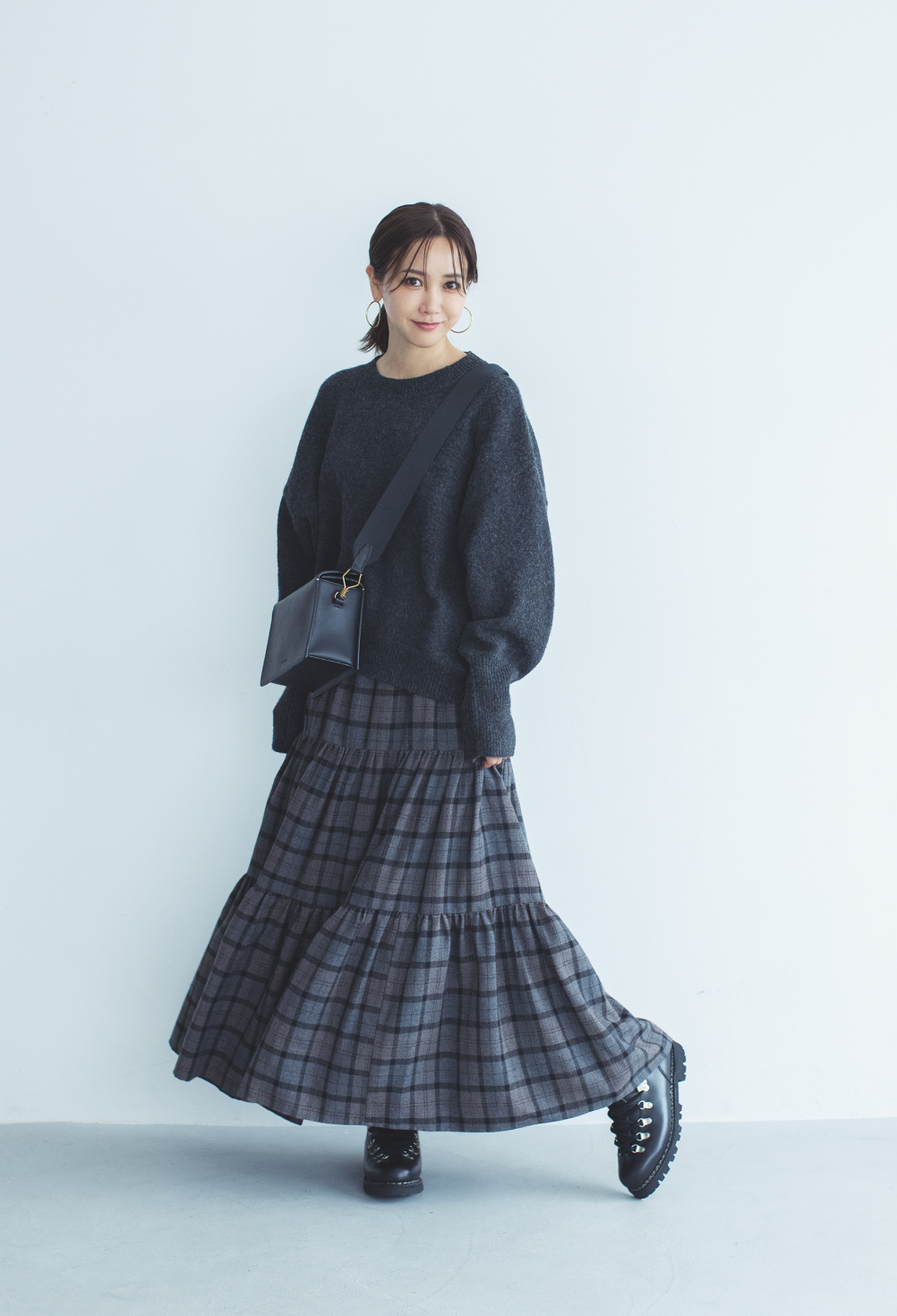 「足首までしっかり隠れる長さのティアードスカートは、贅沢にギャザーを寄せながらも、ほどよいボリューム感にこだわりました」 全身をダークカラーでまとめたら、ボーイズライクな小物でキリッと引き締め。「ほんの少し甘さを抑えるくらいが、大人好みに仕上がる秘訣です」