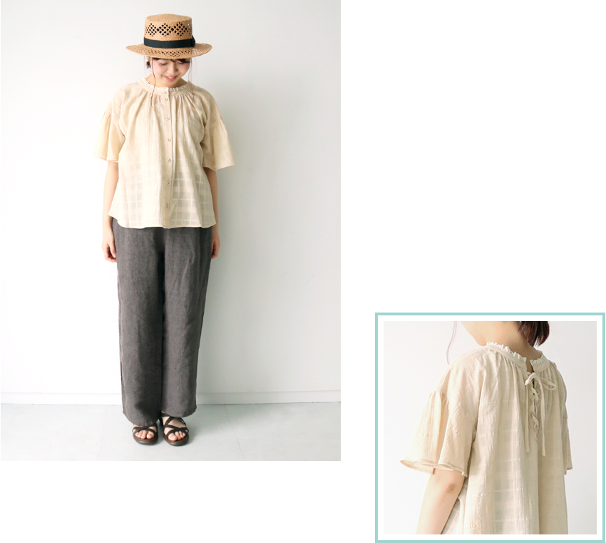 編み上げリボンの涼しげブラウスはリラックス感のあるイージーパンツと合わせて。重ね着いらずの首元レースが暑い夏に嬉しい。