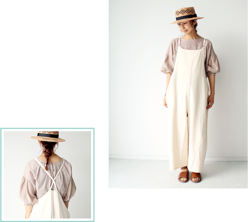 ゆるっとしたサロペットにレースブラウスを合わせたサマンサらしいスタイル。袖をくしゅっとさせてふんわり感を出すと二の腕カバーにも◎