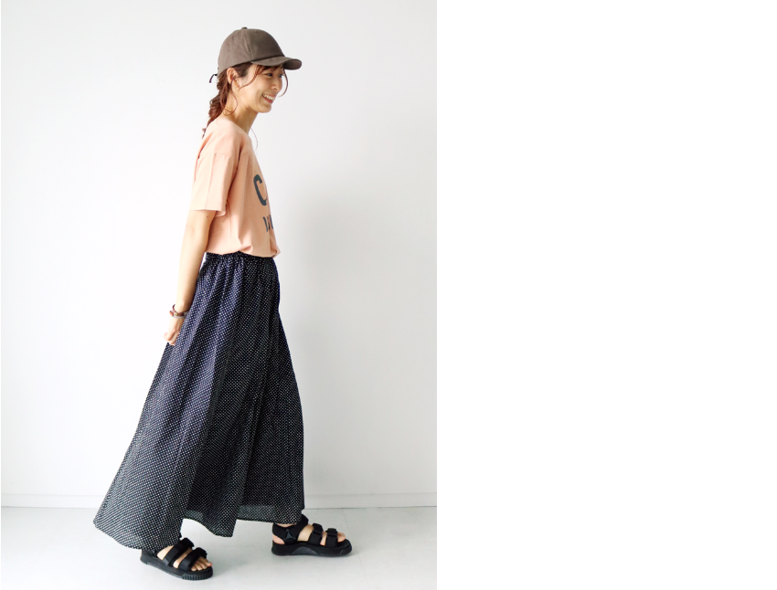何枚あっても助かるロゴTシャツ。スポーティーな着こなしにも、ふわっと揺れるドット柄スカートで可愛らしさを忘れずに。