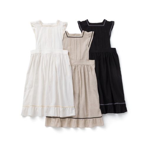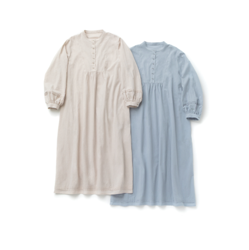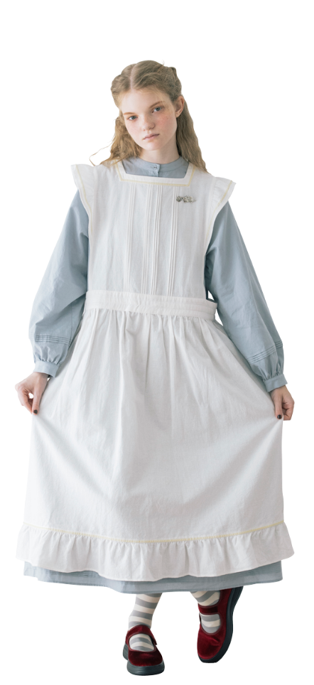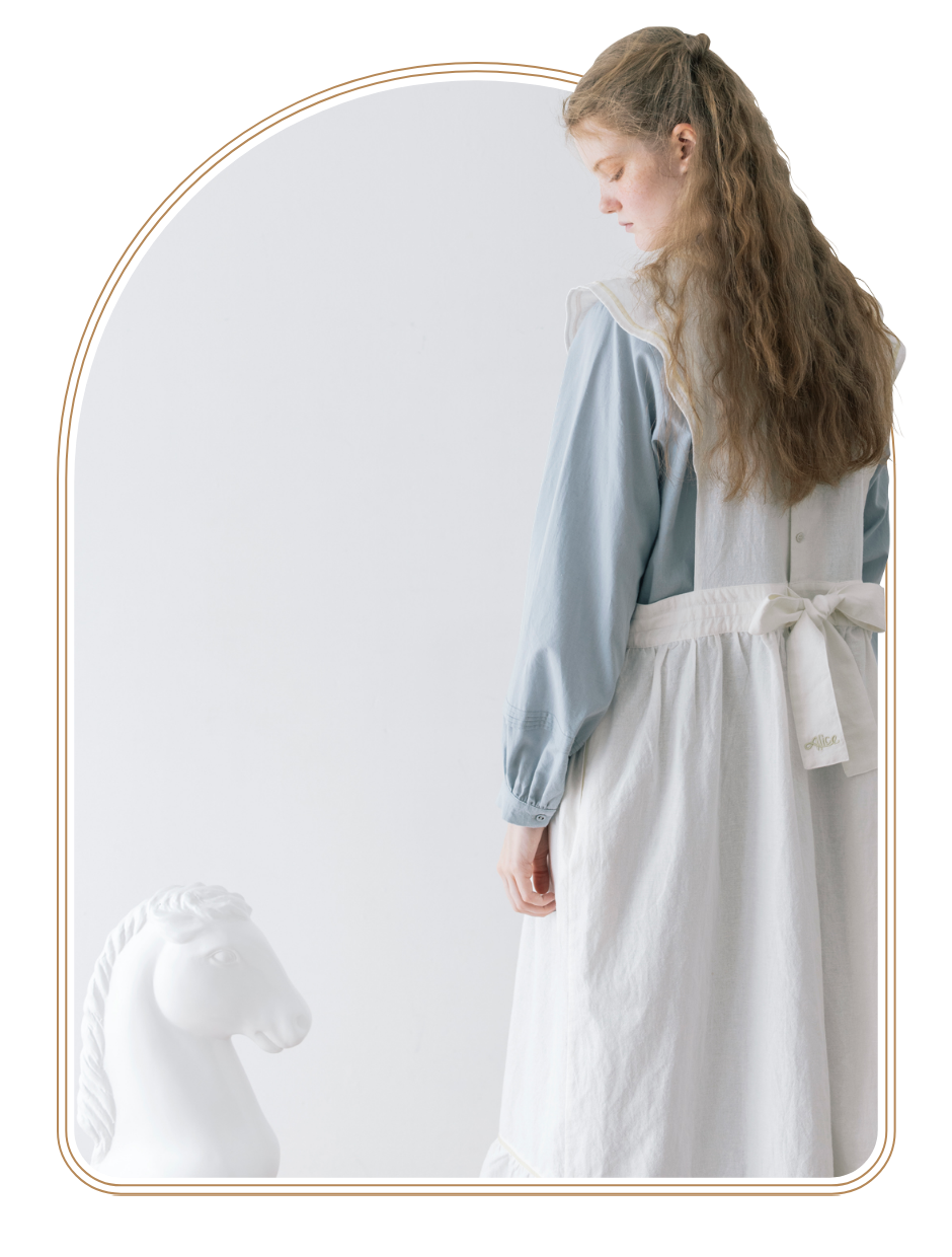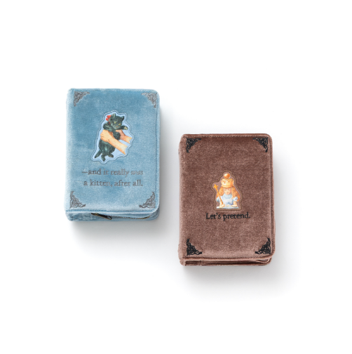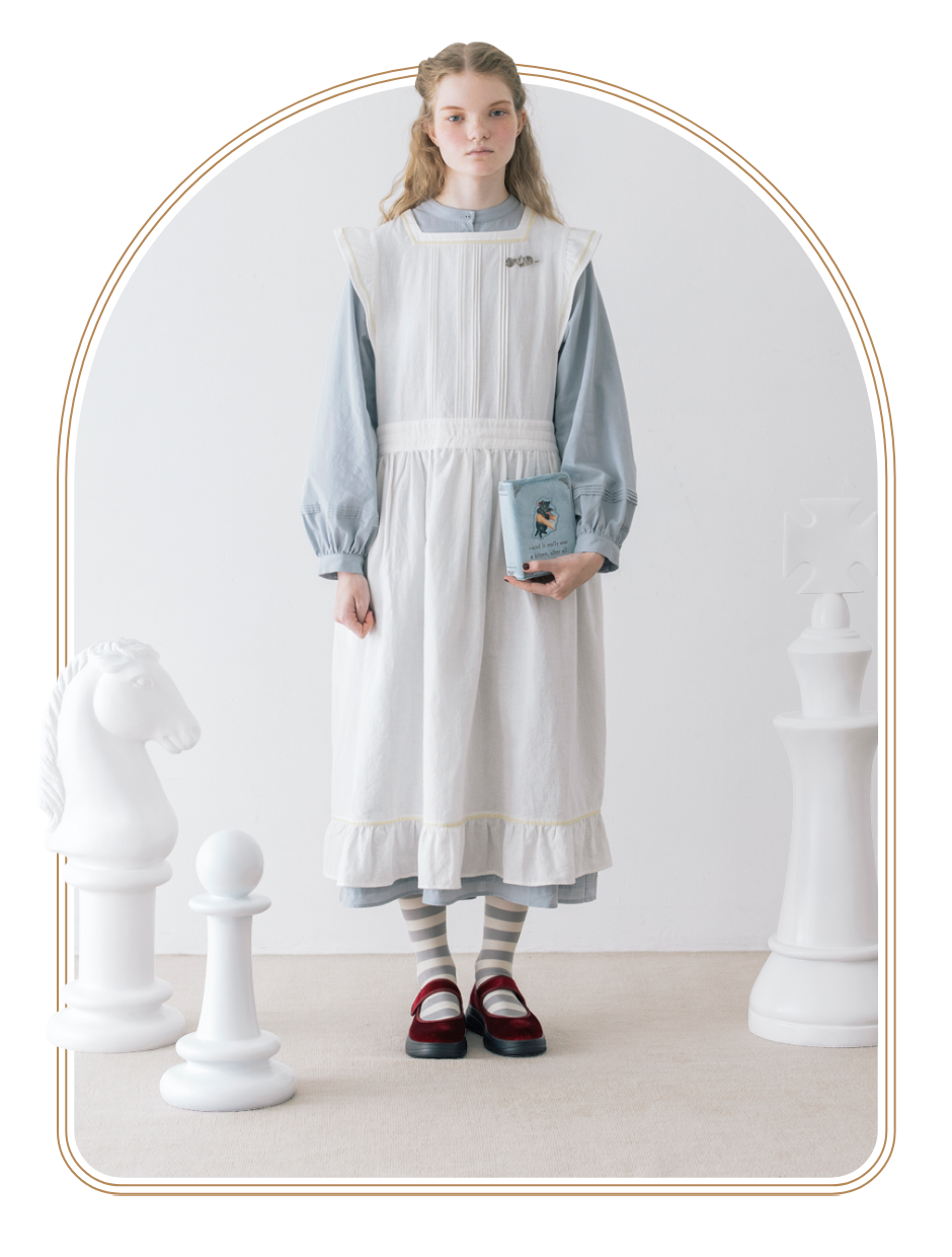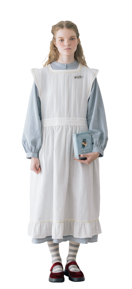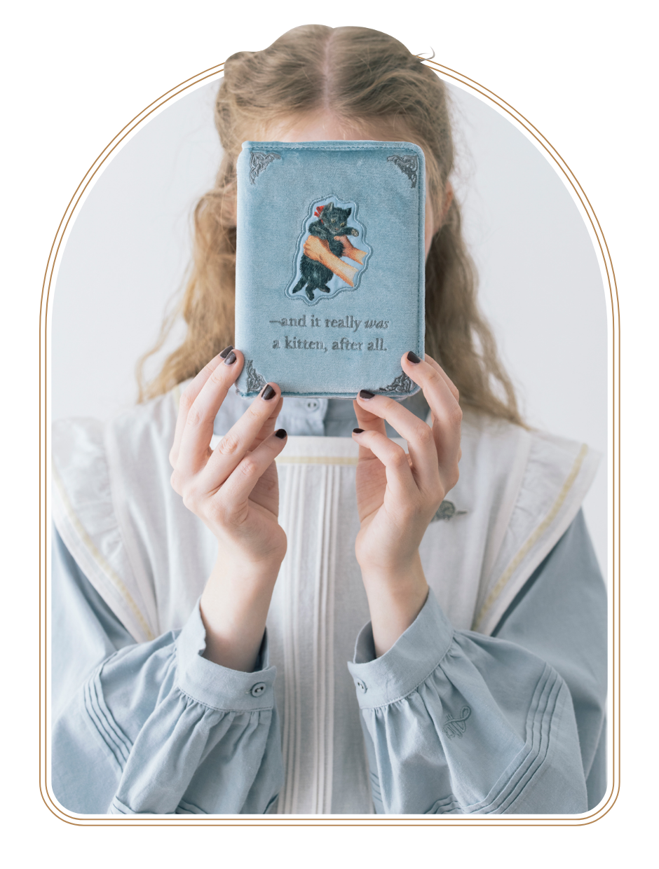 天然素材の自然なハリ感と、柔らかな色で上品なアリススタイルに。袖口の刺繍やピンタックなどサマンサ モスモスらしいエッセンスもたっぷり。物語に登場する猫が描かれたブック型ポーチや、ブローチなど小物にも注目!