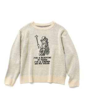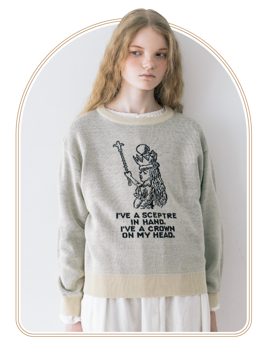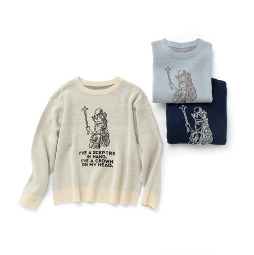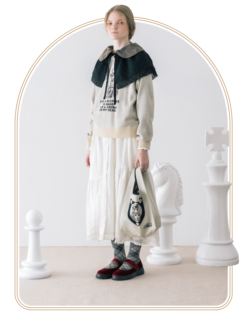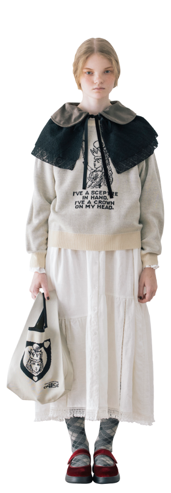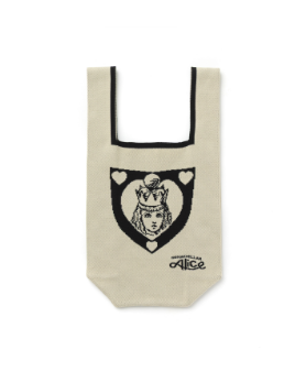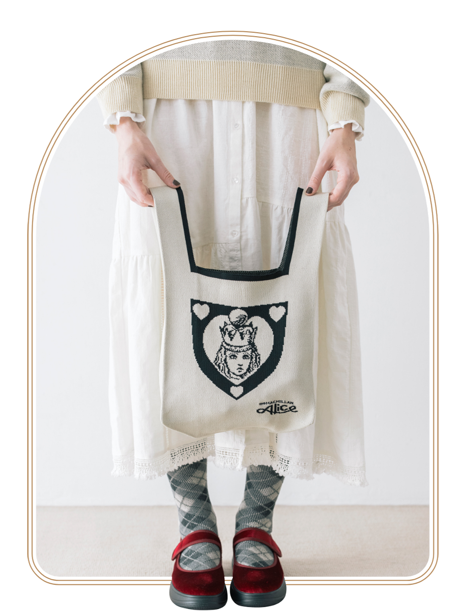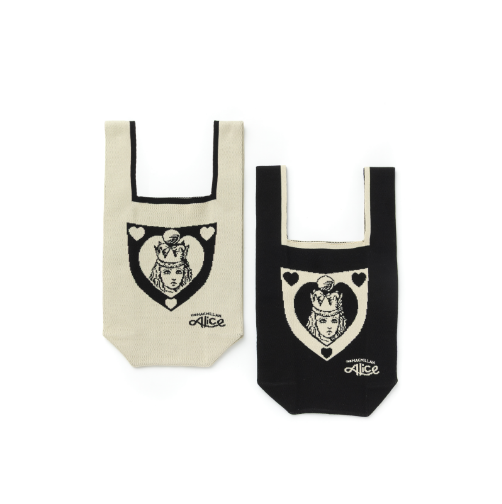 チェスの女王になったアリスをジャカード織りで描いたニットは存在感大。シンプルなコーディネートでも世界観が際立ちます。どんなスタイルにもプラスしやすい、お揃いのニットバッグもラインナップ。