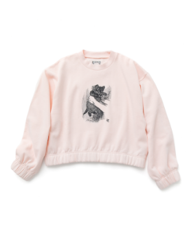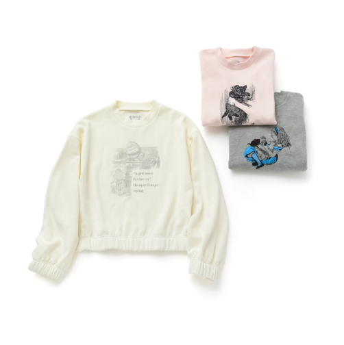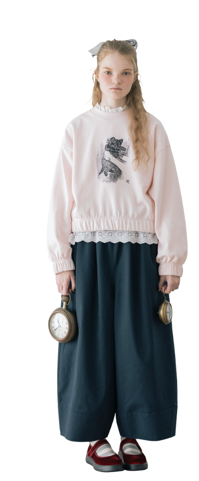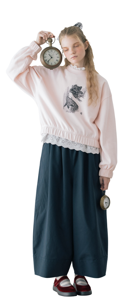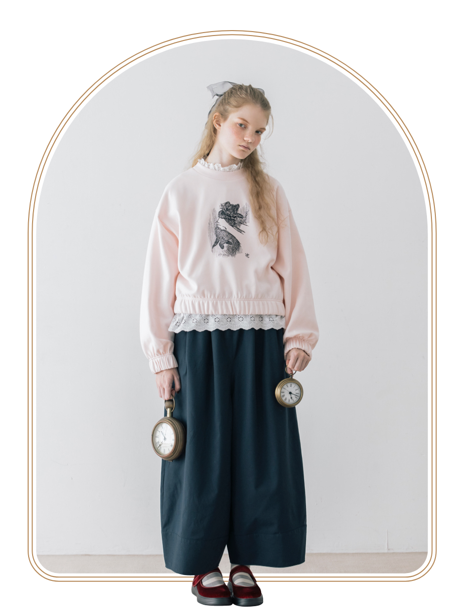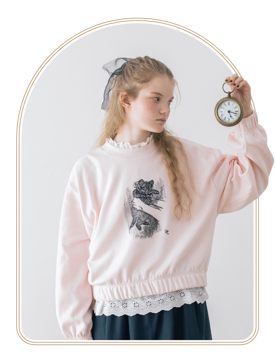 アリスのモチーフが刺繍とプリントで描かれた、デイリースタイルにも便利なスウェット。裾と袖口はふんわりギャザーがアクセント。重ね着で首元や裾からレースをのぞかせれば、カジュアルになりすぎない着こなしに。