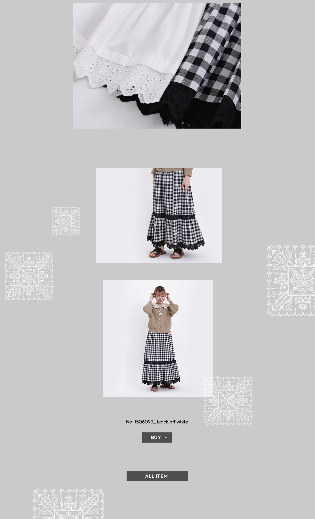 サマンサ定番の裾レースのティアードスカート。二種類のレースを使いました。