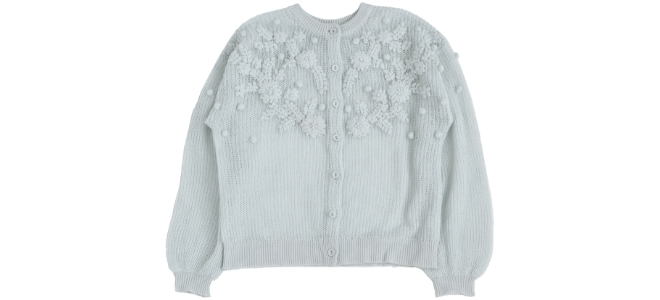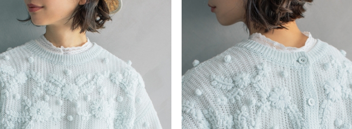 花とポンポンの立体的な刺しゅうが魅力。