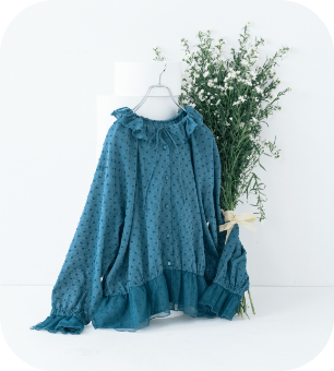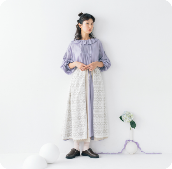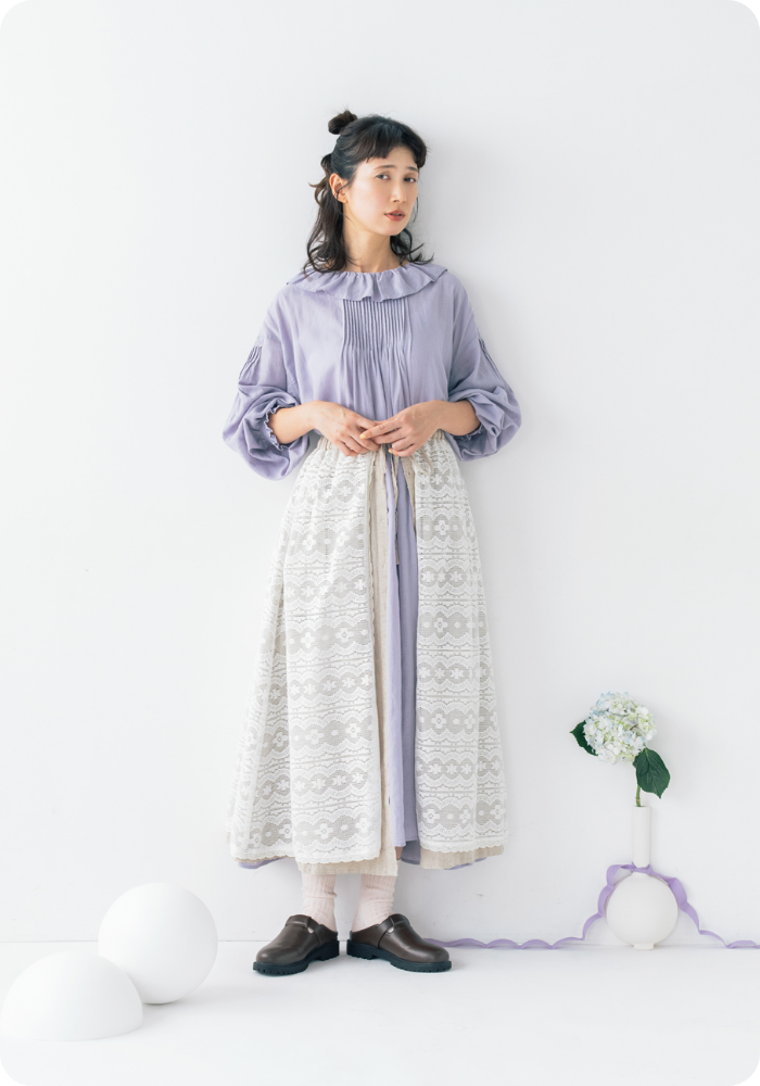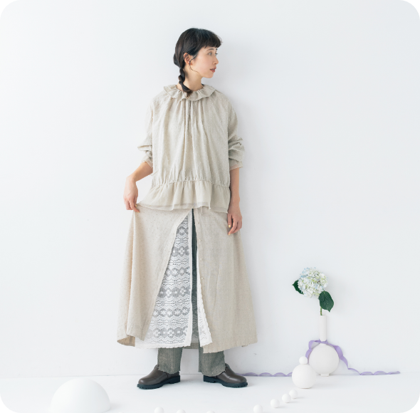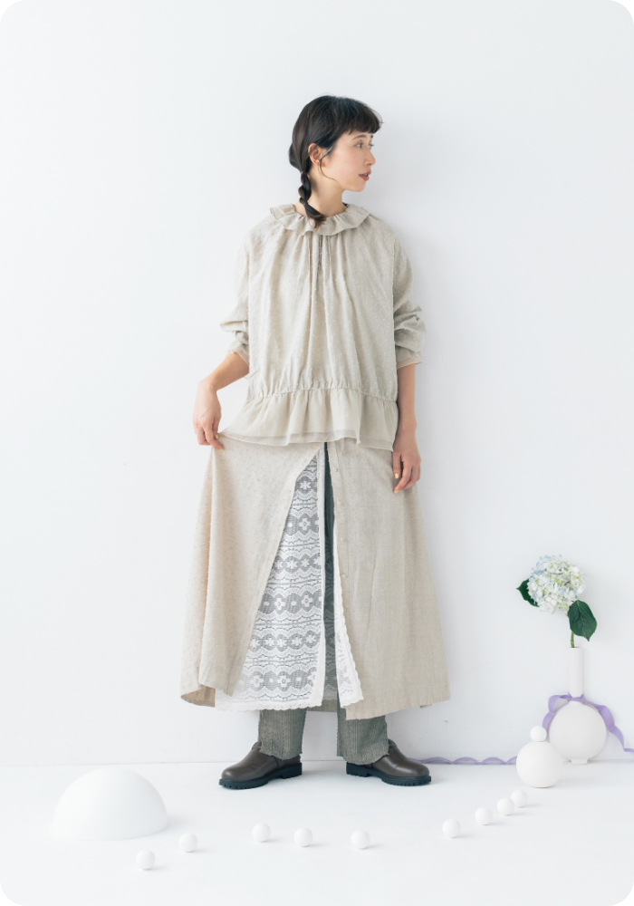 前後着ができるほか、前開きタイプなのでガウンのように羽織ることもできます。一枚で着るのもいいですが、個人的には重ね着でいろんなアレンジを楽しんでもらいたいです!