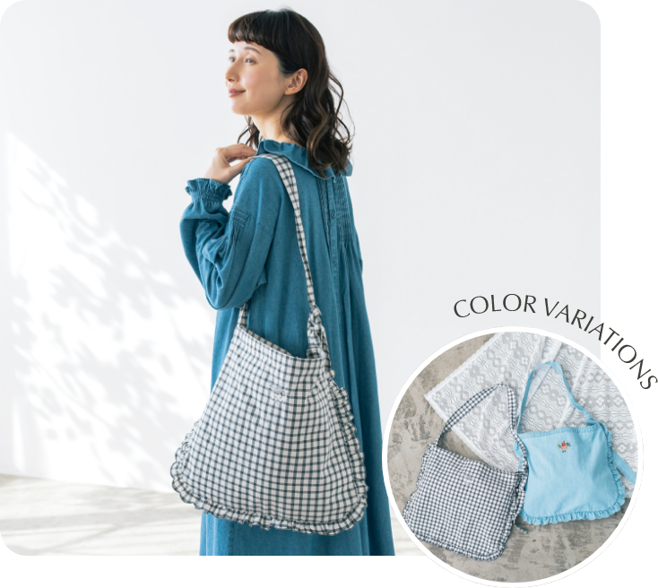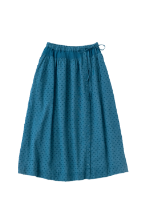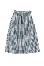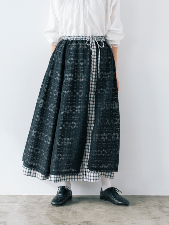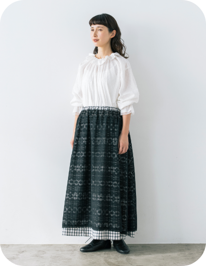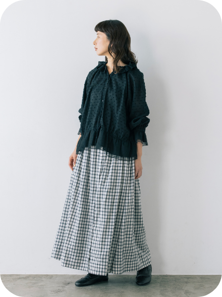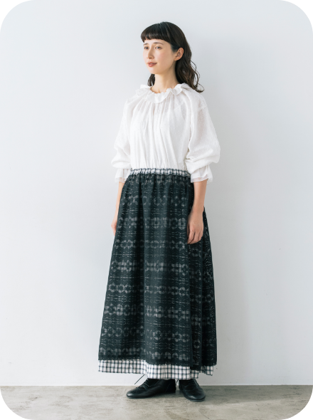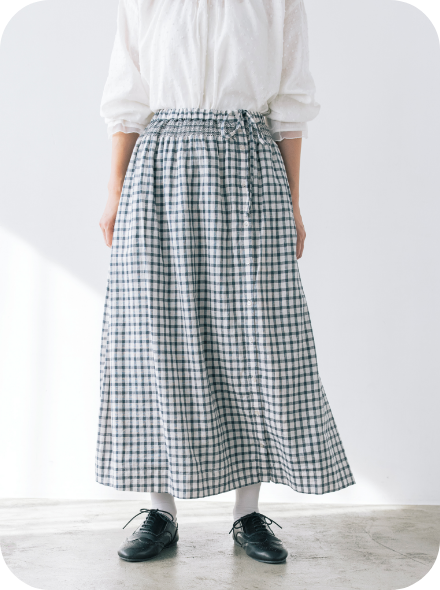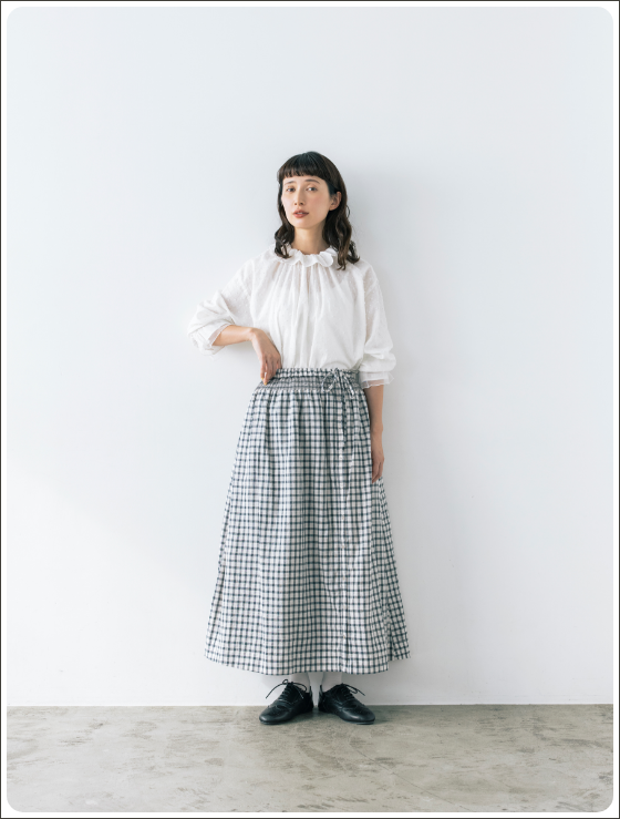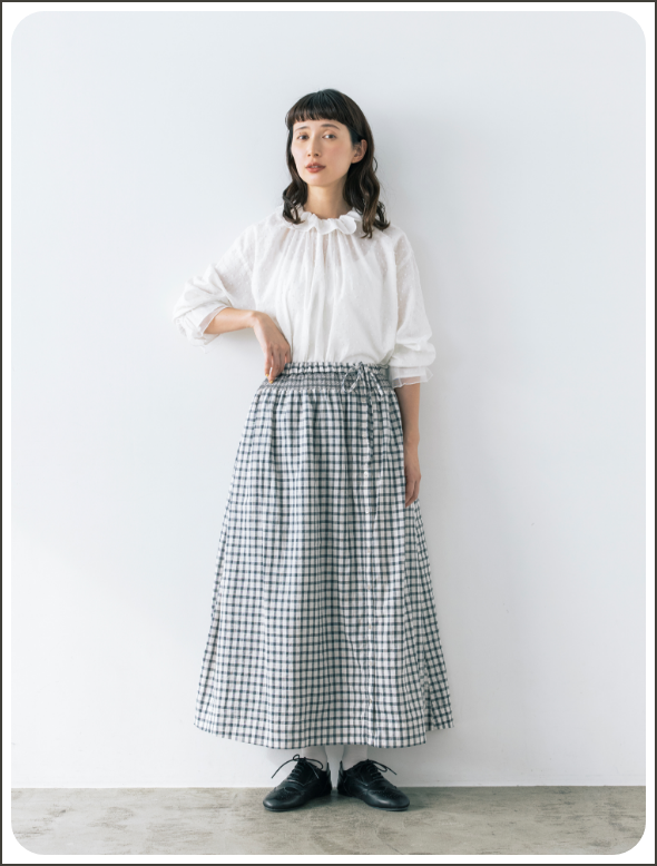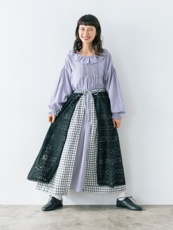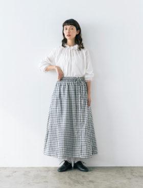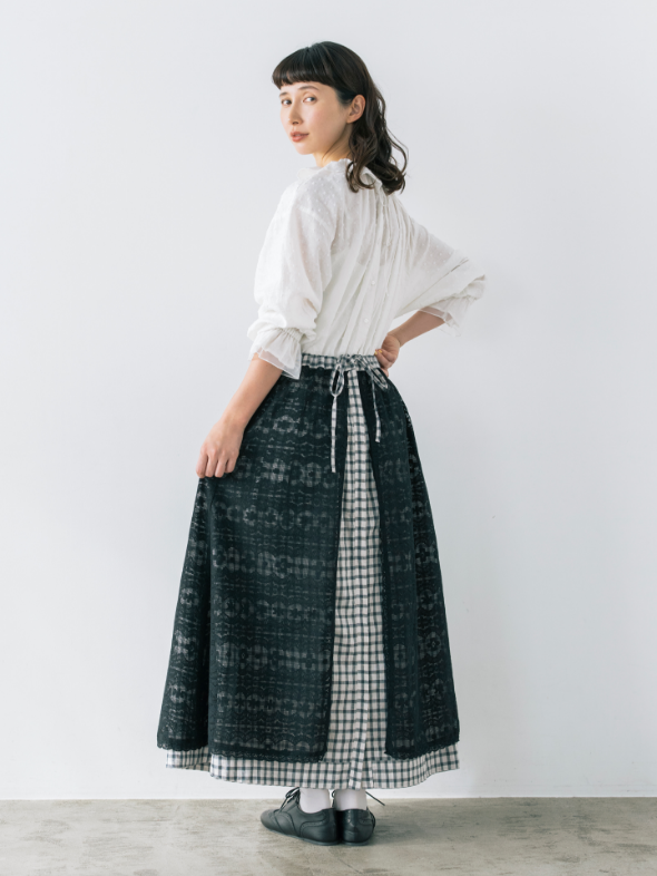 スカート以外に、エプロンのように巻くこともできるマルチWAYなリバーシブルアイテム。表地のボタンの開け閉め加減で、さまざまな表情を見せてくれます。グラフチェック柄以外は、コラボアイテムのブラウスと同素材のセットアップが可能です。