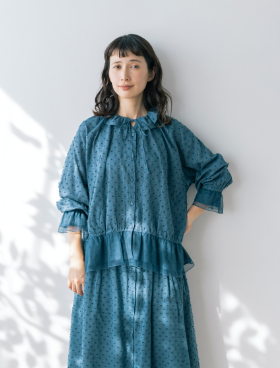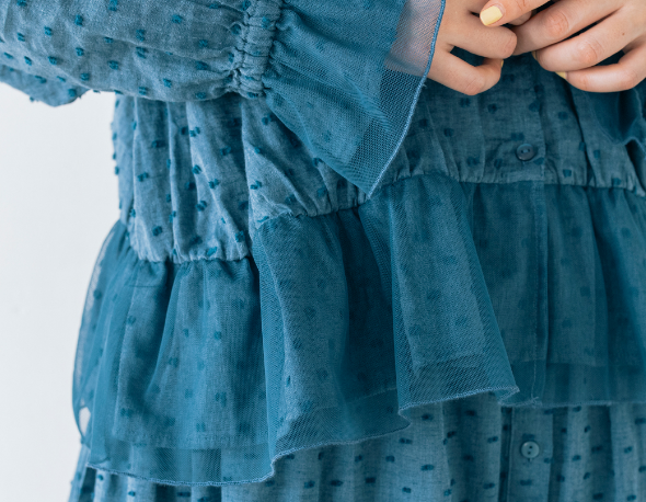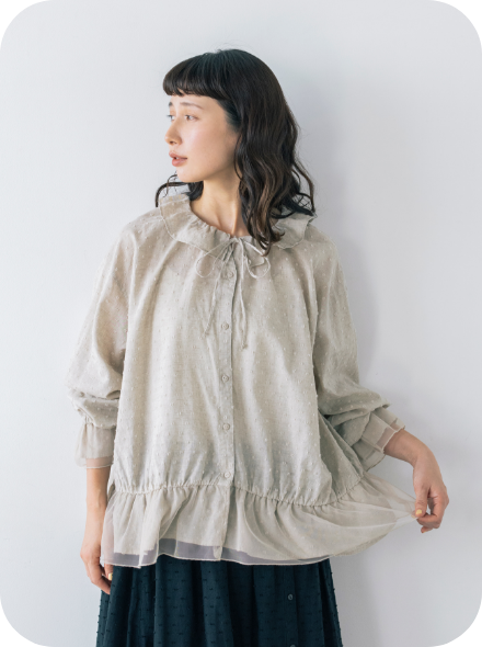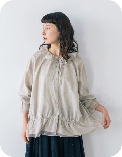 水玉模様のような凹凸のあるドビー生地を使ったブラウス。フレンチリネン混のコットン素材が心地よく、さりげなくあしらわれたチュールが、軽やかな春へと誘います。ゴム入りの袖口なので、たくし上げるとこなれたニュアンスに。