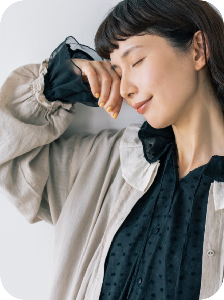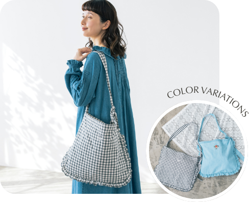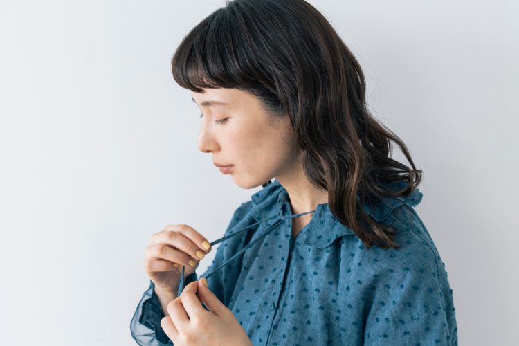 衿元に施されたリボンを絞ると、ギャザーが寄って衿が波打ち、その立体感のおかげで顔まわりがさらにパッと華やぎます。