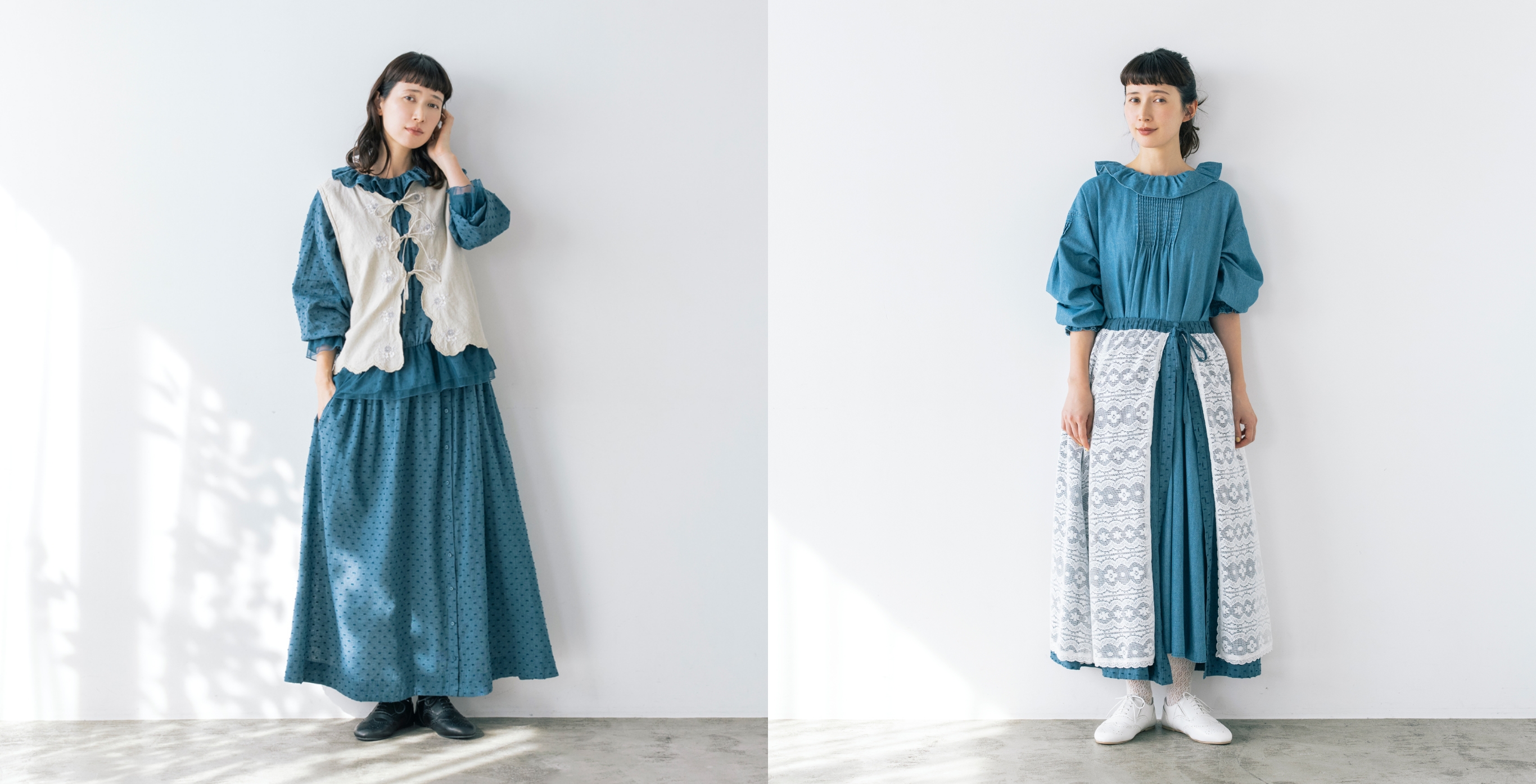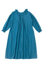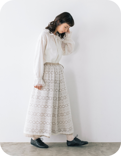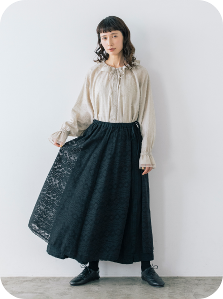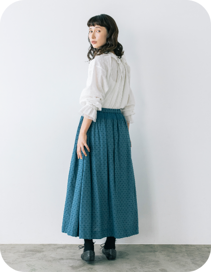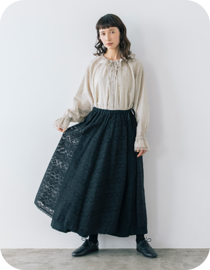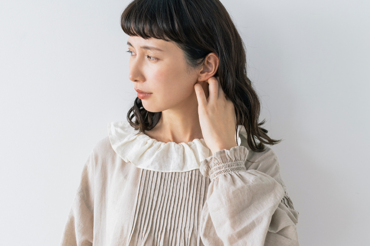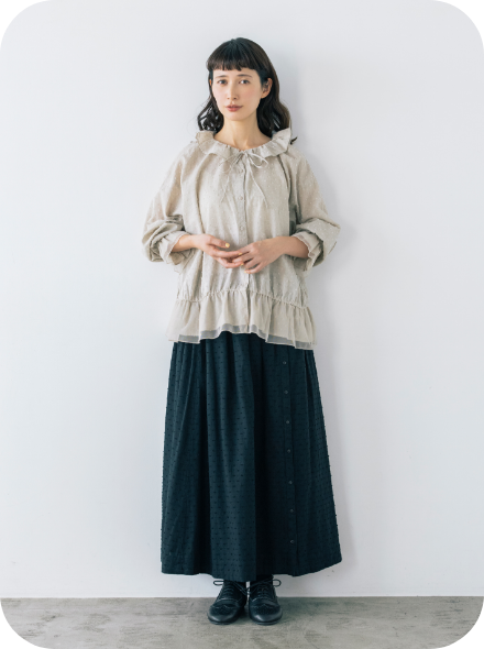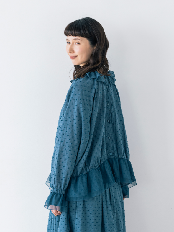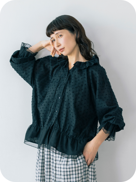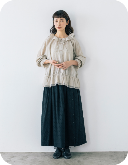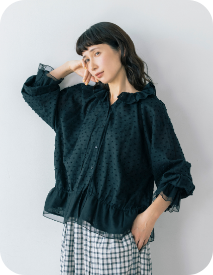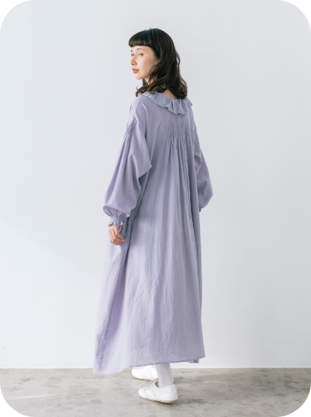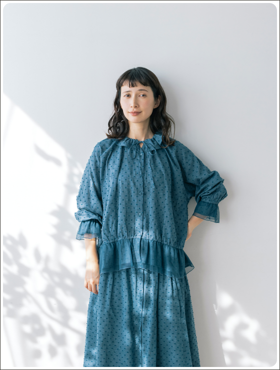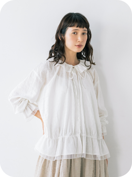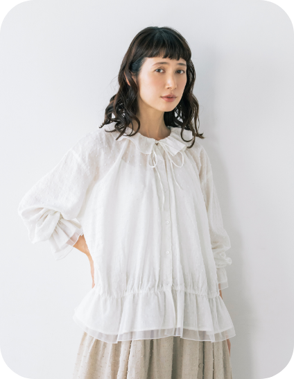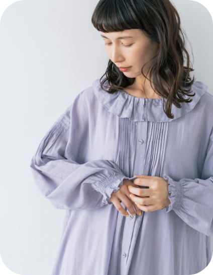 フリル衿とシャーリングを入れた袖口で甘さを出しながら、繊細なピンタックでヴィンテージ風の雰囲気も高めて。