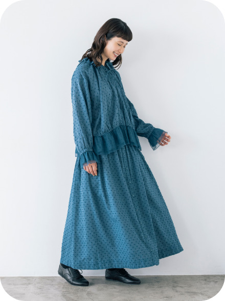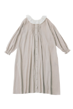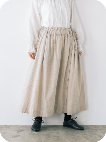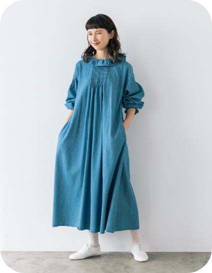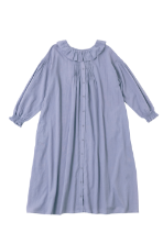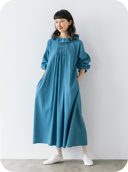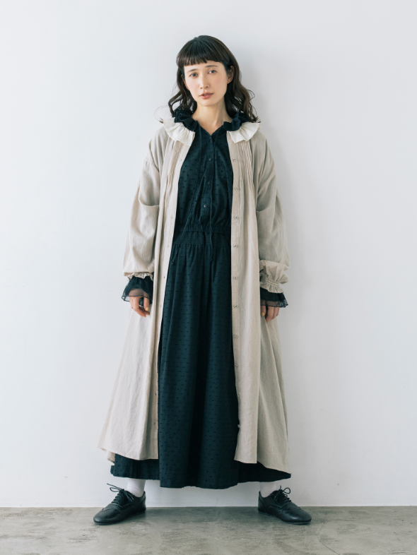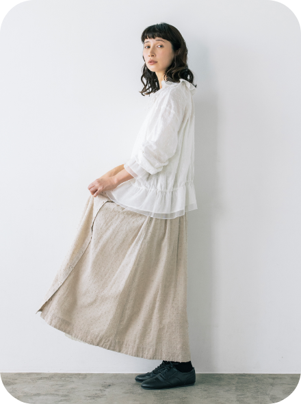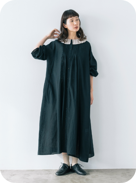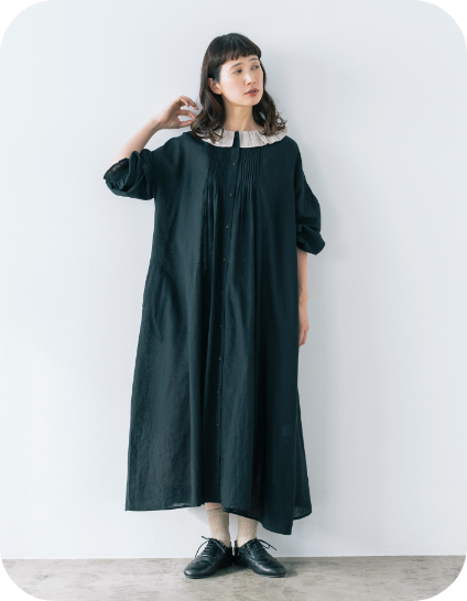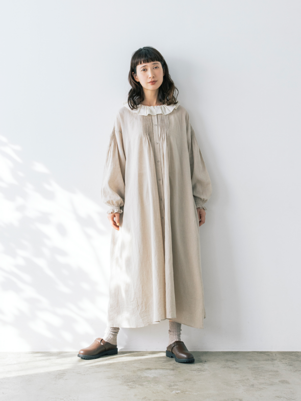 春風に揺らめく、やわらかなフレンチリネン混コットン素材のワンピース。袖口には、コラボアイテムのスカートと同じシャーリングが施され、重ね着をするとさりげなくリンクできます。大人ガーリーなムードは、フリル衿とピンタックで醸し出して。
