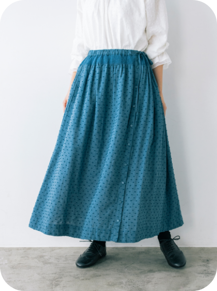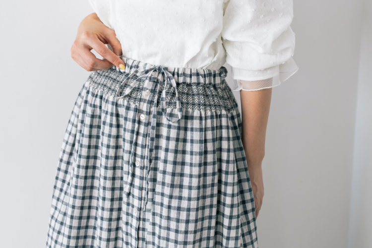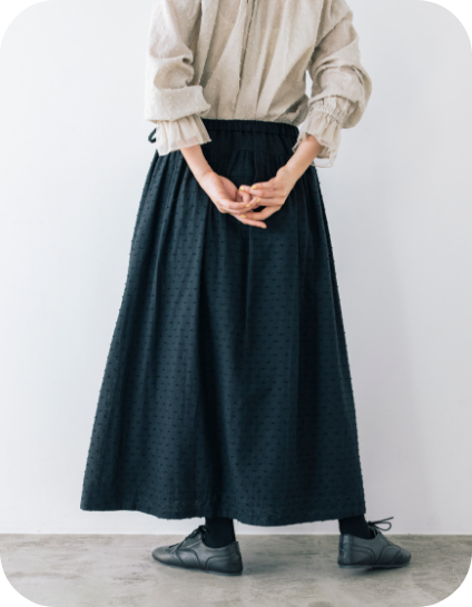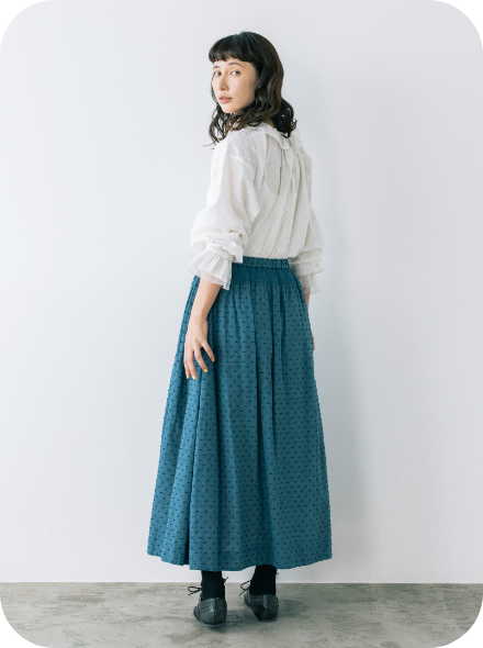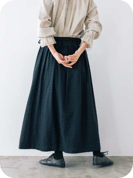 ゴムウエストの下に施された太めのシャーリングは、トップスをインしたときのアイキャッチ役になってくれます。
