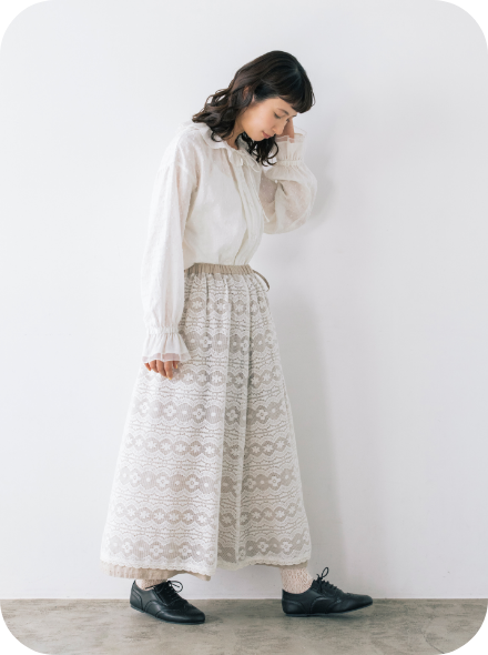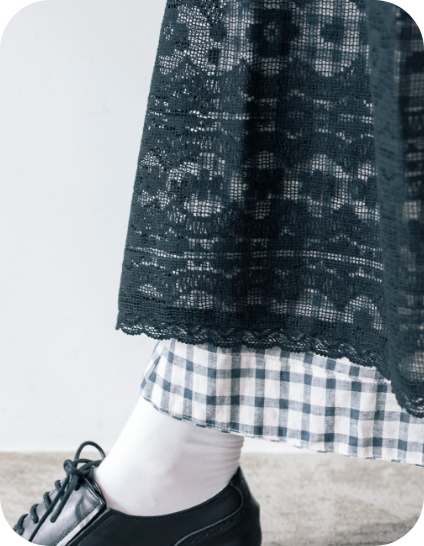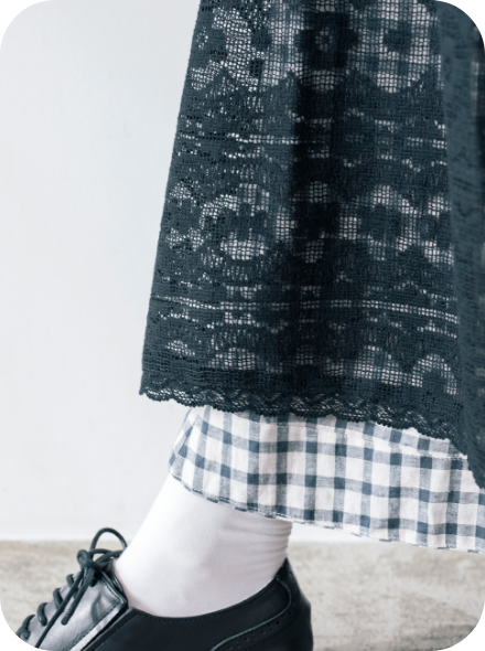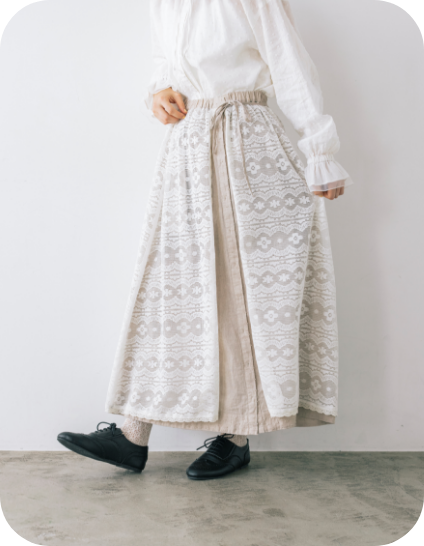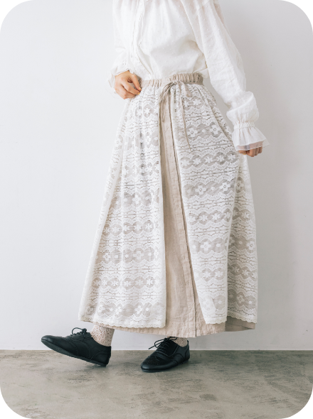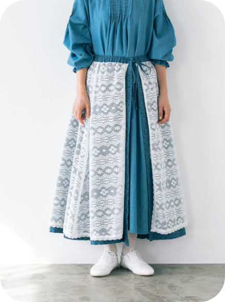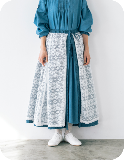 スカートを裏返すとレース面になるリバーシブル仕様。1着で流行のエプロンレイヤードが簡単に完成する優れたアイテムです。