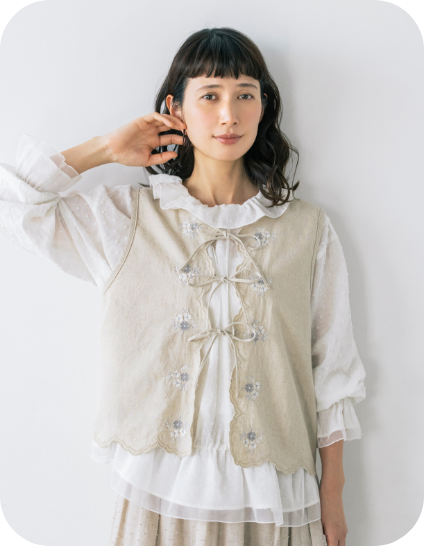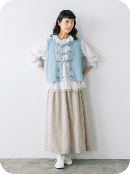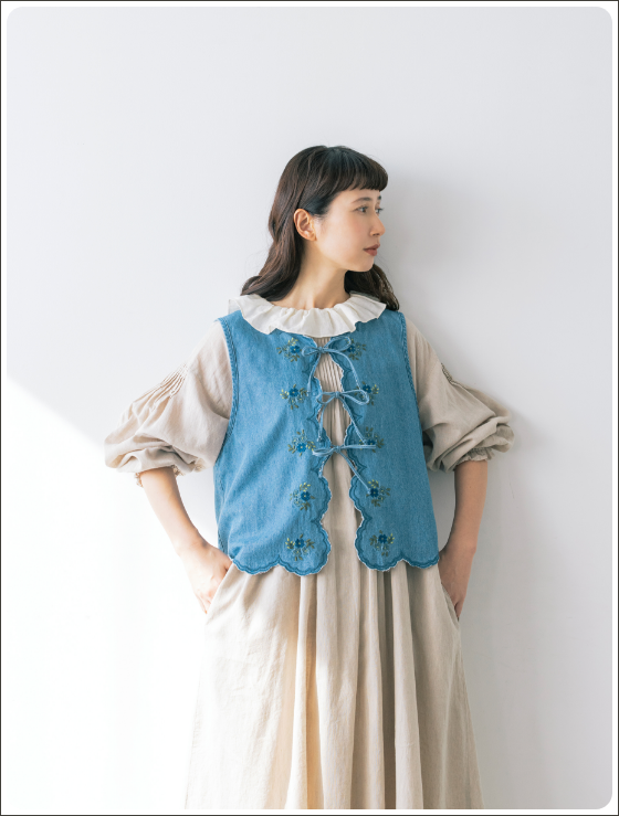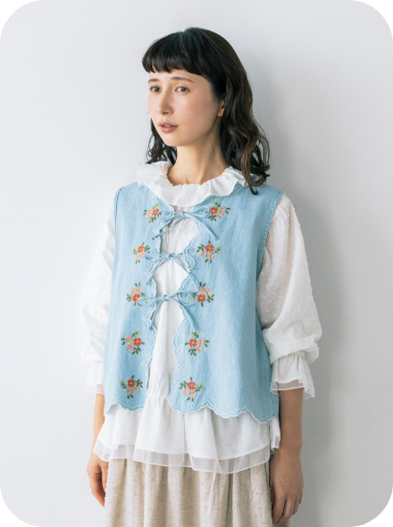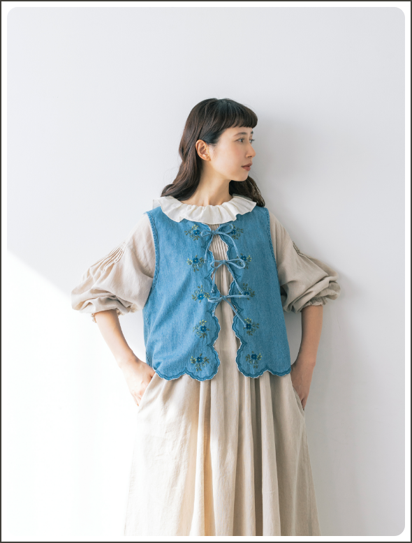 レトロ可愛いフレーバーを漂わせたい日にぴったりな、お花の刺しゅうベスト。色によってイメージが変わり、デニムはカジュアル、ベージュはナチュラルな雰囲気に。薄手のコットン100%なので、春、夏、秋の3シーズン使えます。