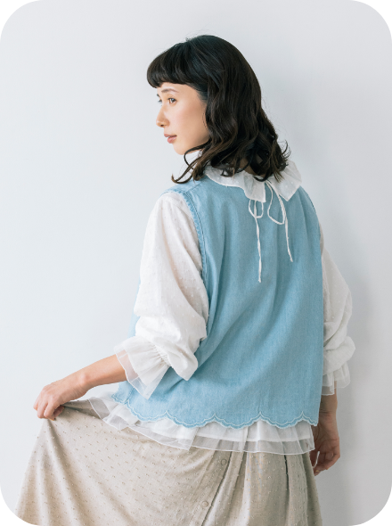 重ね着するだけで、コーディネートをリズミカルにしてくれるウェーブ状のスカラップデザイン。お花の刺しゅうにも、思わず胸キュン。