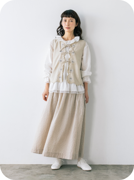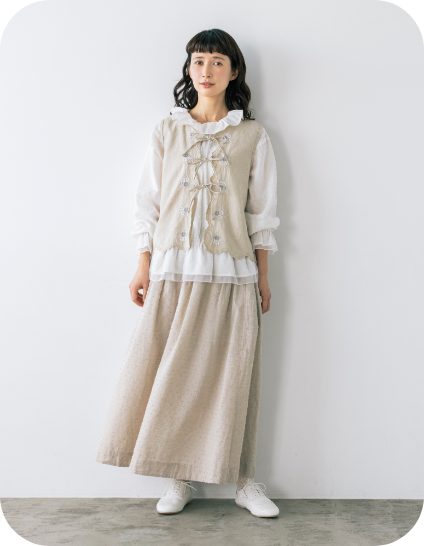 表地のボタンをすべて外してウエストでリボン結びするとエプロンスカートに。さまざまなボトムスレイヤードを満喫してみて。