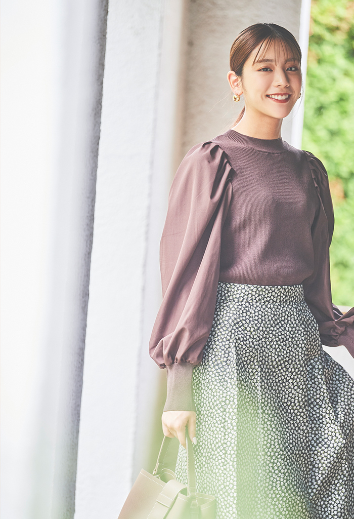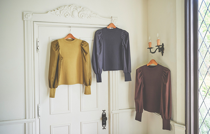 トレンドのボリュームスリーブがフェミニンなニットトップス。品のある細めのリブニットと、スリーブ部分のブラウス生地の異素材切り替えで、1枚で着映えするデザインに。差し色になるイエローと、こなれた印象のチャコール、ベーシックなブラウンの3色展開です。