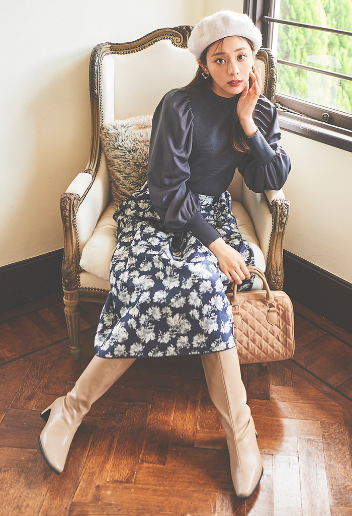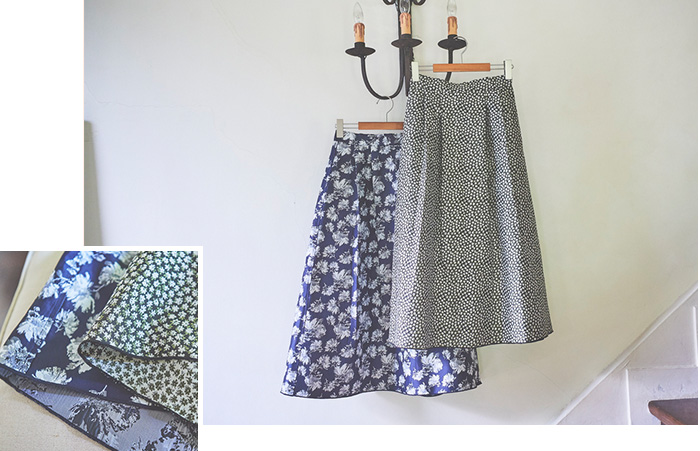 ハリのある上品なジャガード素材がクラシカルムードたっぷりの花柄スカート。大人っぽい中花柄のネイビーと、可愛らしい小花柄のブラックの2種類のバリエーション。リバーシブルで着ることでカラーニュアンスが変わり、ひと味違った雰囲気の装いが楽しめます。