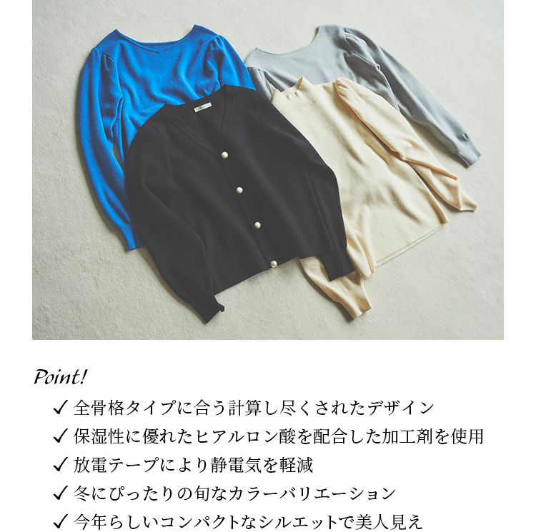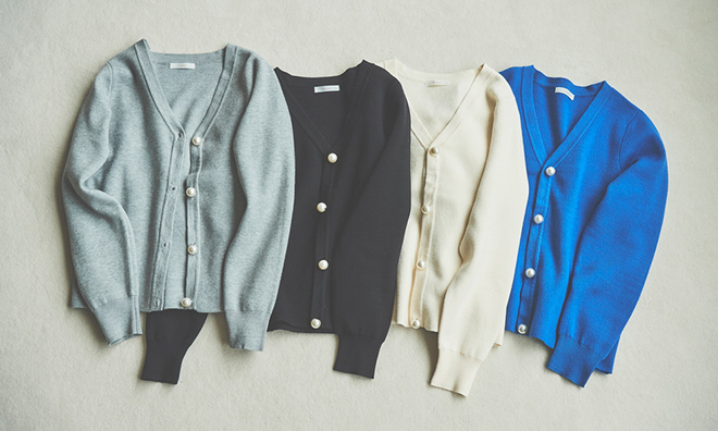 大きなパールボタンをあしらい、トレンド感のあるデザインに仕上げました。内側に隠しボタンがついているため、前は開け閉め両方で着ていただけます。他のニットと重ねてアンサンブルでも着られるよう、身幅はややゆったりめに設定。今年流行りの襟やボウタイ付きのブラウスとも合うよう、ネックはVを選びました。