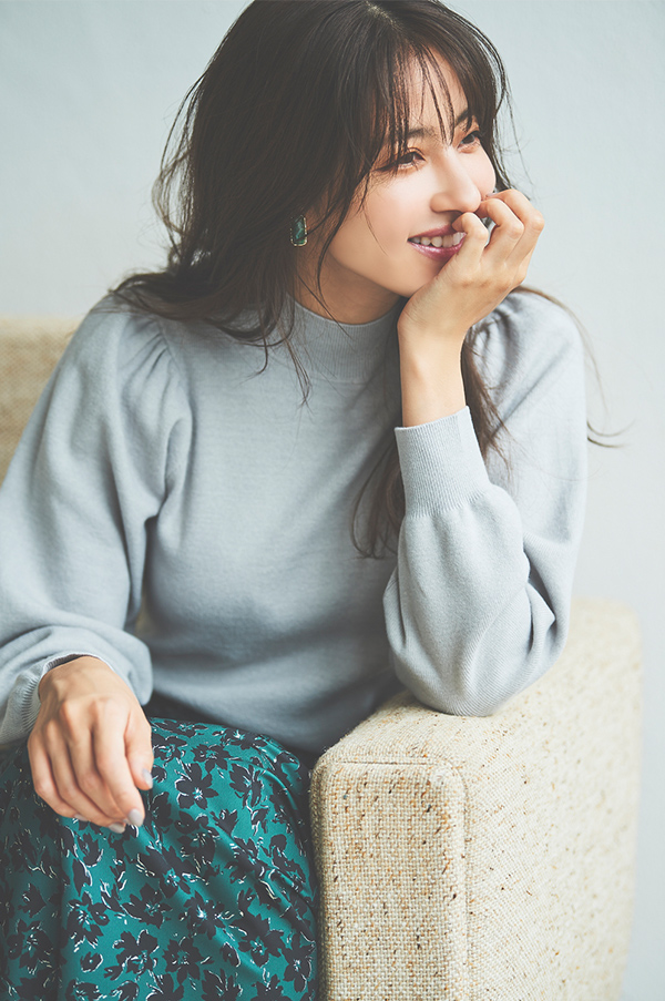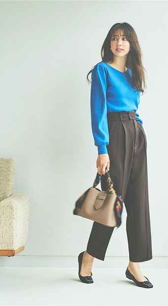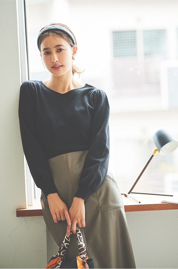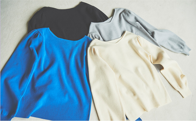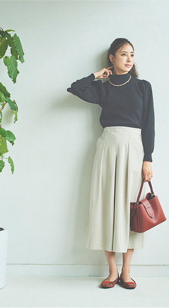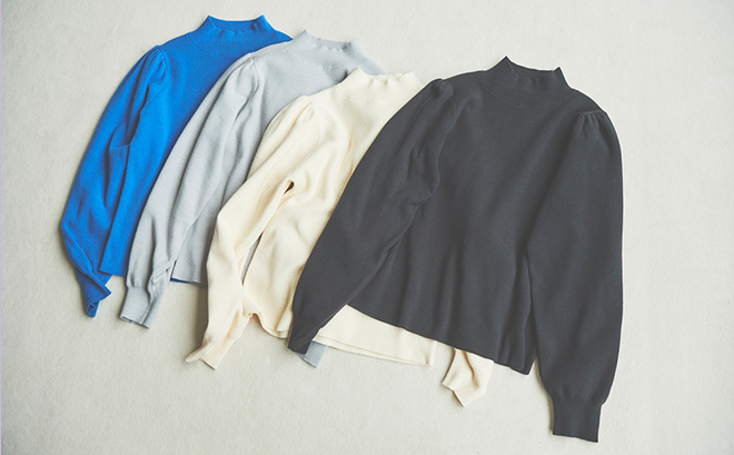 ベーシックなハイネックデザインに、今年らしいボリュームスリーブを加えました。ナチュラルやストレートタイプの骨格の方でも肩まわりが強調されすぎないよう、袖のボリュームの切り替えをやや内側に設定したのがこだわりです。裾はリブで絞らずフラットにしているので、ウエストはOUTでもすっきりと着こなせます。