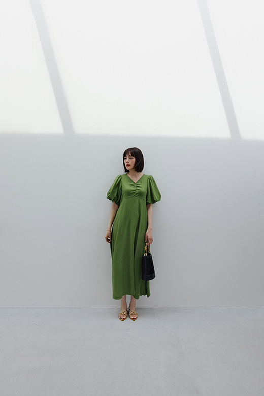 差し色にはフレッシュなグリーンのバッグを抜擢。