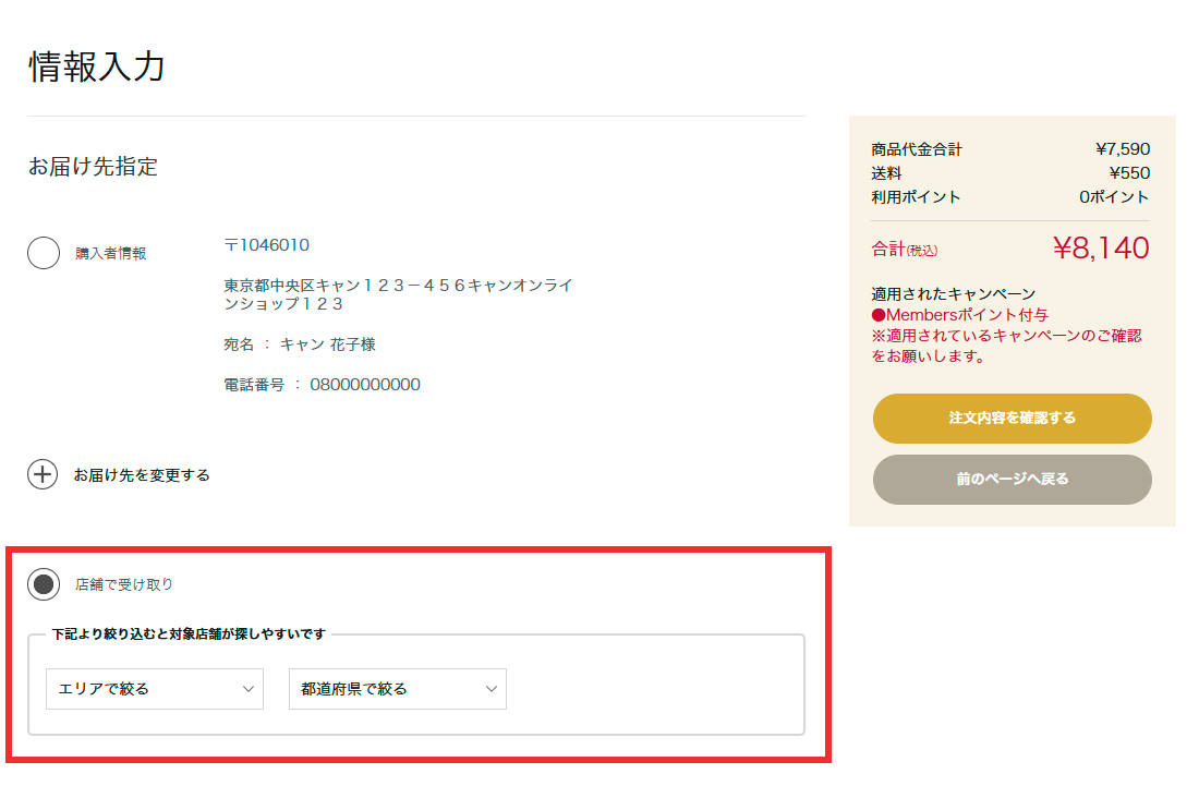 - 情報入力画面にて『店舗で受け取り』を選択