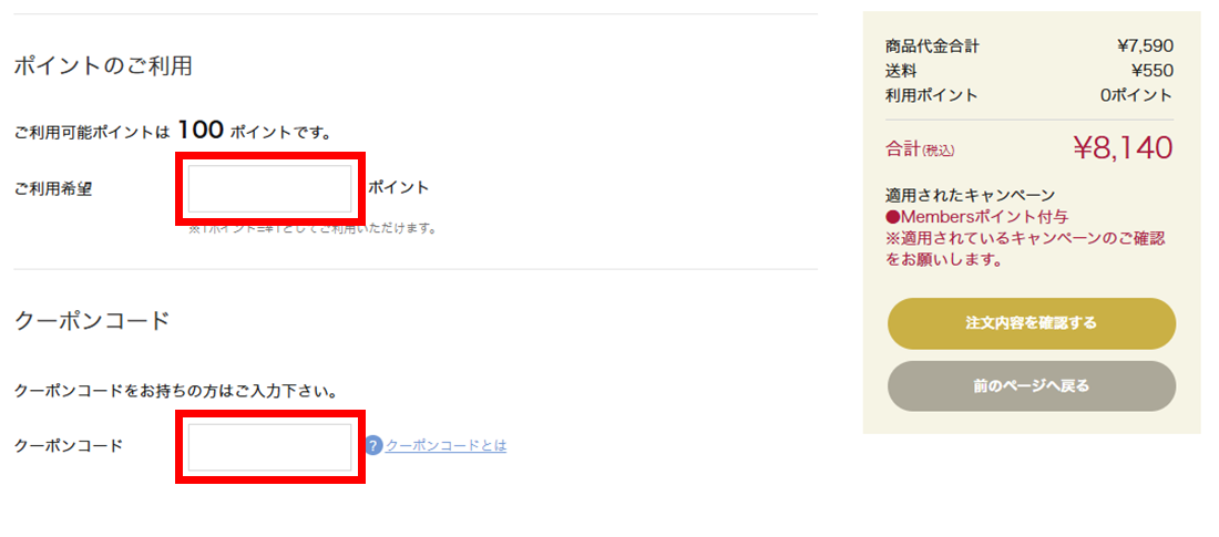 - ポイント、クーポンを利用する場合は入力し、『注文内容を確認する』へ進む
