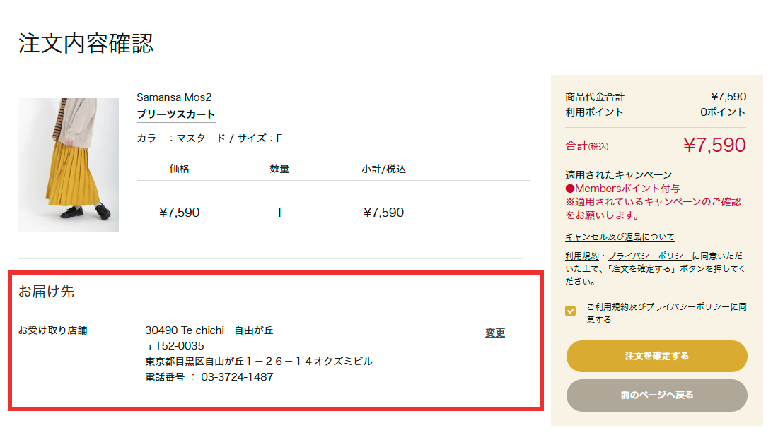 - 注文内容確認画面にて『お受け取り店舗』を確認